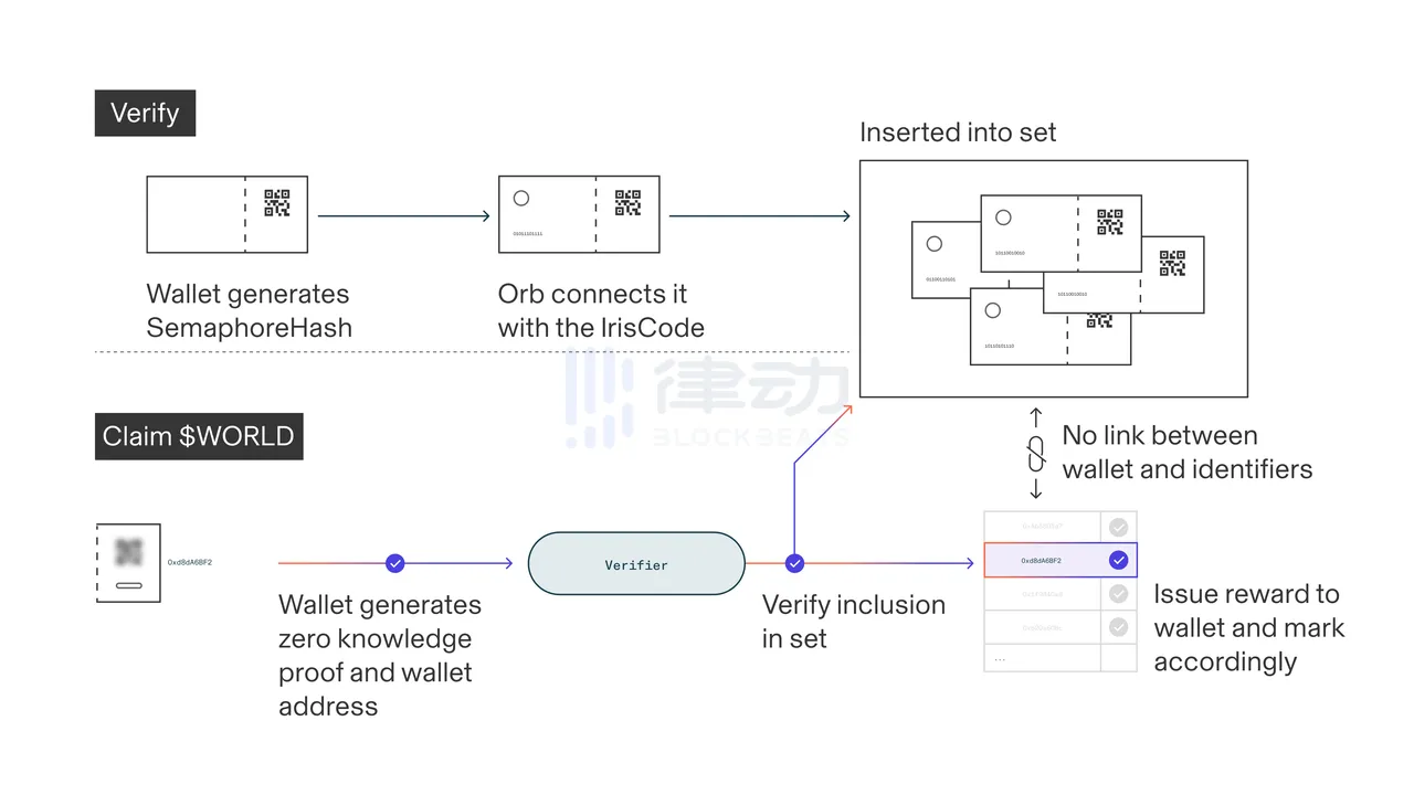 尽管 Orb 不要求填写姓名、地址和电话号码等个人信息,但生物识别的信息采集显然更为敏感。在 Worldcoin 的既定方案中,采集眼部图像之后将其经过哈希函数生成唯一标识符,随后将永久删除眼部图像。并采用开源的 Semaphore 零知识证明系统来增强隐私保护。