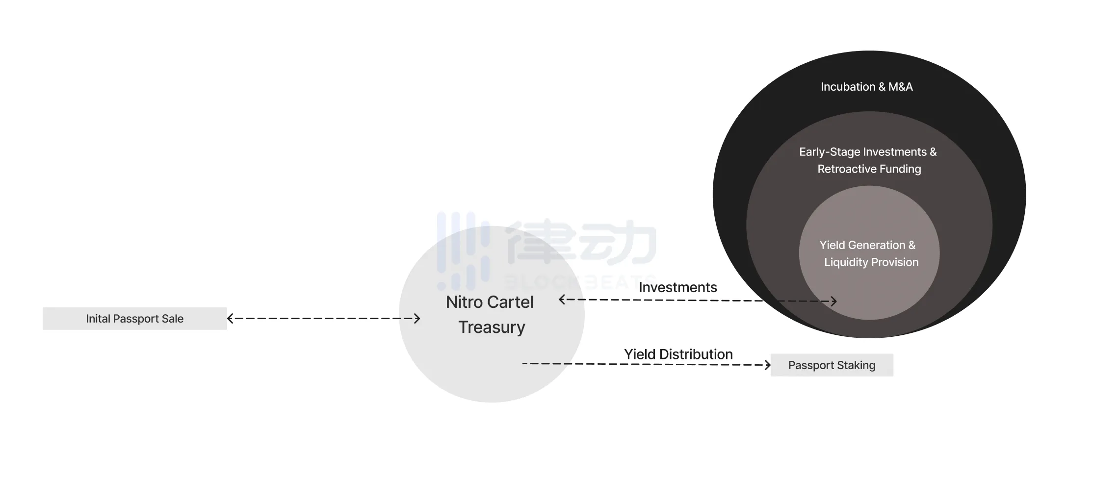Passport 是 Nitro Cartel 的初始治理工具,也是早期 Nitro Cartel 成员的身份证明,Passport 使用 ERC-1155 而不是 ERC-20 作为治理工具,以期获得更广泛的持有者群体。Passport 初始供应量为 800 份,均通过固定价格进行 Mint。每铸造 5 份 Passport,就会有 1 份作为团队分配永久锁定。团队计划未来在更多子 DAO 和产品发布后,会引入 NITRO Token 作为混合治理机制。