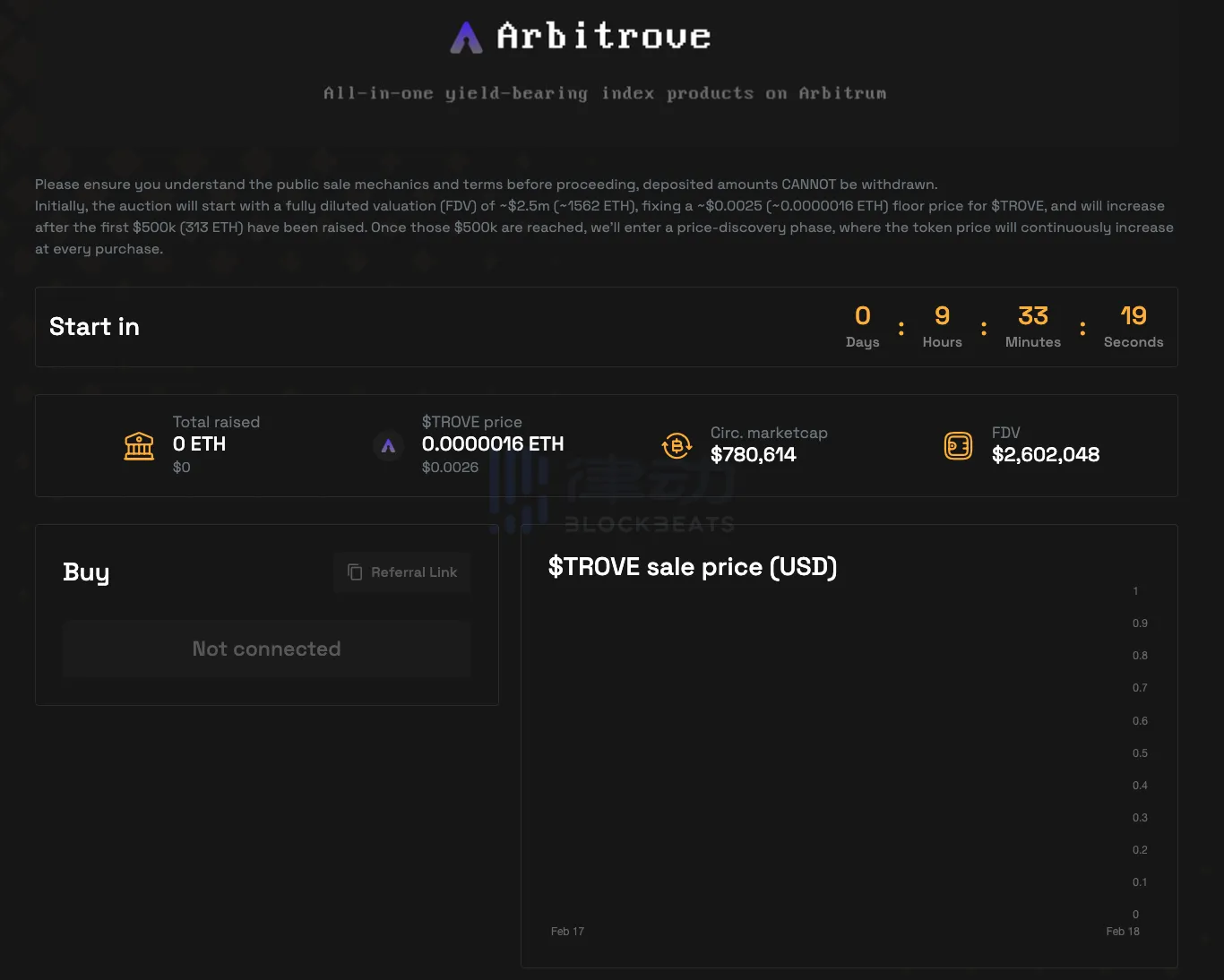 团队以约 250 万美元的 FDV 为 TROVE 固定 0.0025 美元的底价。在 Public Sale 资金达到 50 万美元或约 313 ETH 后,TROVE 价格将随每次购买不断上涨。在 Public Sale 页面下方有推荐链接,通过该链接引导参与者加入可获得 3% 的奖励。