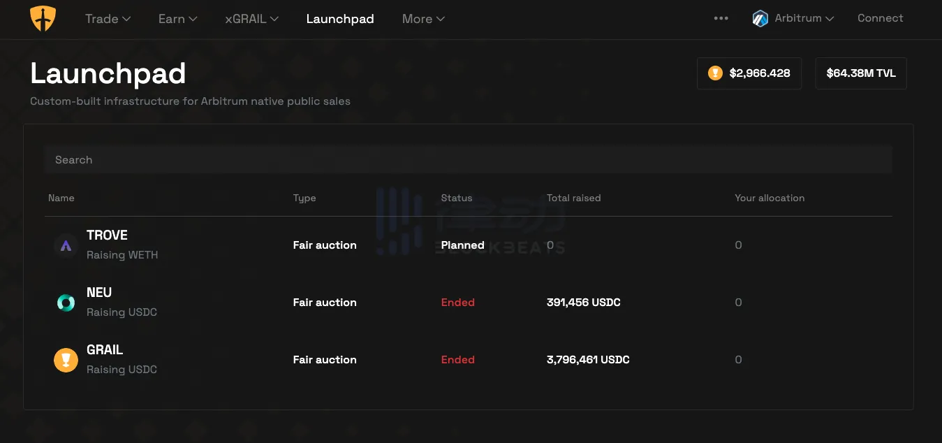 前往 CamelotDEX官网,点击 Launchpad 便可看见 TROVE Public Sale 的标签以及 Camelot 平台往期 Launchpad 项目。点击 TROVE 进入 Public Sale 页面。