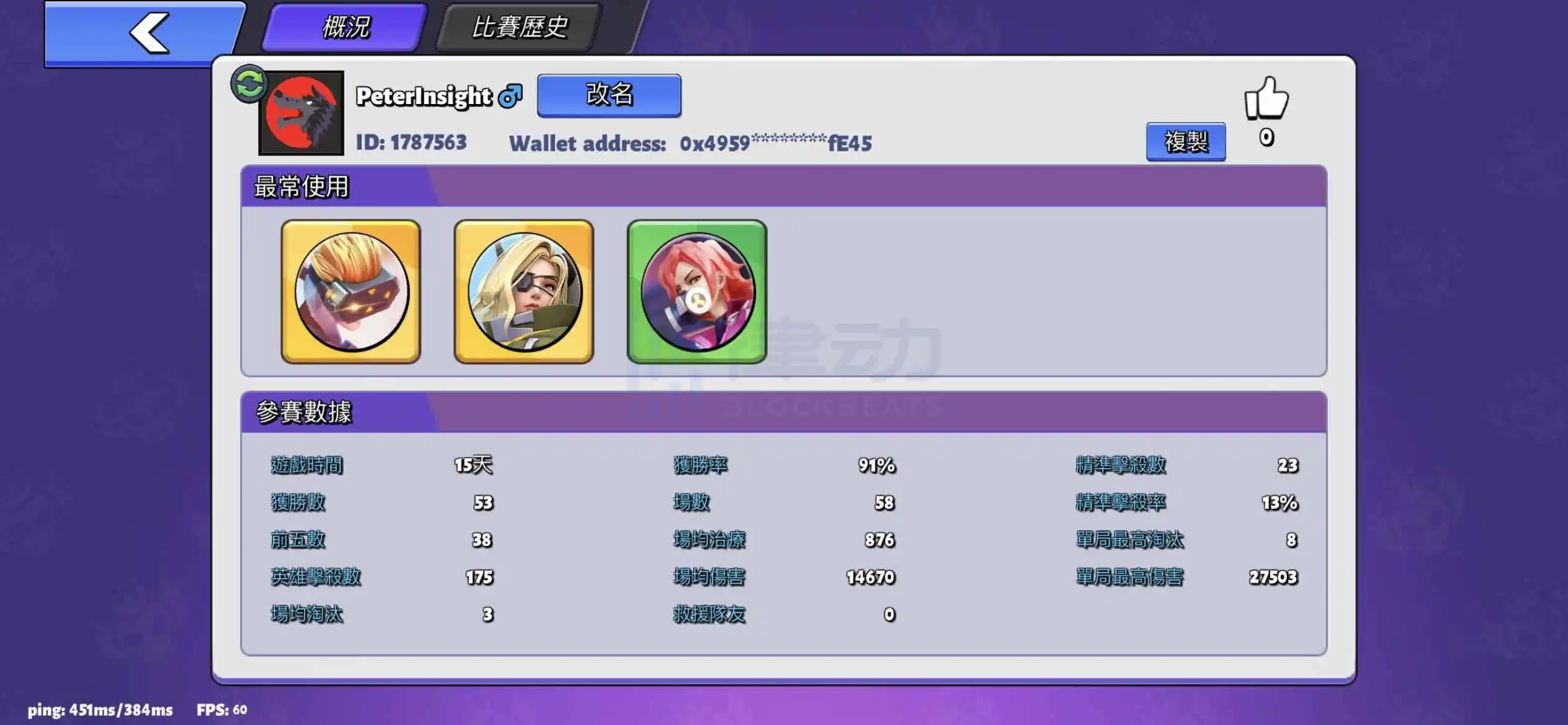 在该页面,玩家可以找到自己钱包的地址,以及比赛历史等一些日常的数据,同时还可对自己的个人游戏主页进行一些个性化定制。