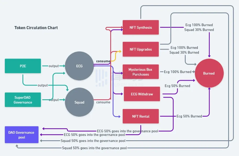 ECG 是游戏内实用 Token,玩家可以通过赢得战斗和完成日常任务来赚取。它的总供应量是无限的,初始发行量为 10 亿个,其中 1 亿个将用于提供流动性,其余 9 亿个用于构建游戏生态,它的稳定价格为 0.01 美元。