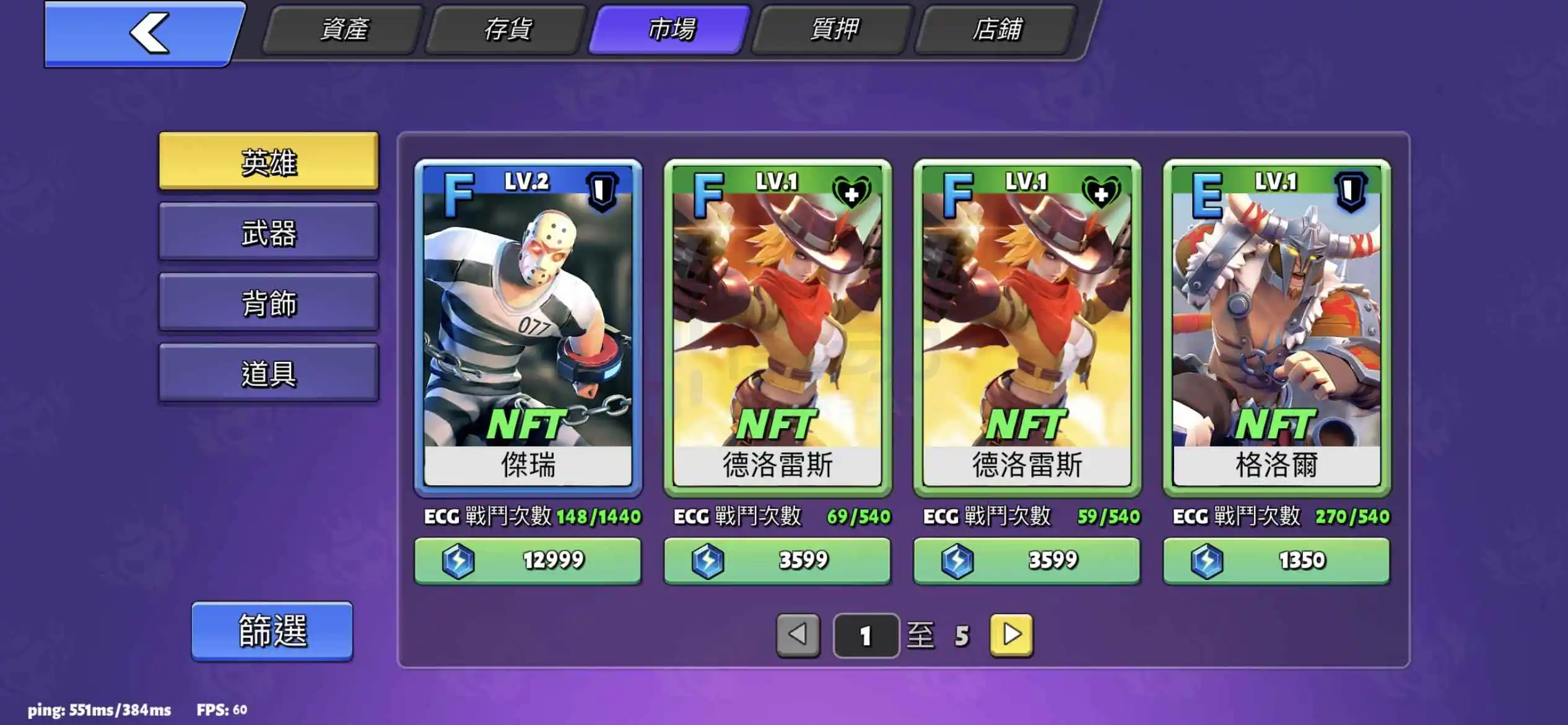 每种 NFT 类型都具有特定的游戏内功能,主要有英雄、武器和饰品等,玩家可在游戏内位于钱包功能中的市场上进行交易,每笔交易将收取 5% 的手续费。