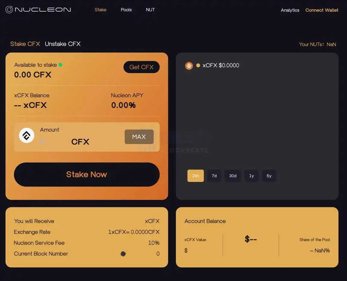 当用户使用 Nucleon 进行质押时,用户会以 1:1 的比例收到质押 CFX 的凭证 xCFX Token。xCFX 可以像常规 CFX 一样用于赚取收益和贷款奖励,并每天更新以反映 CFX 质押奖励。在 Nucleon 质押时不会锁定,并且有 1 CFX 的最低存款以降低 DDoS 风险。NUT 是 Nucleon 的治理 Token,可用于质押投票并提高质押利息回报。NUT Token 分配由项目团队定义,可在二级市场上交易。