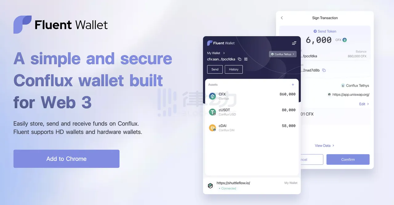 Fluent 是 Conflux 生态中主推的网络钱包,目前支持 Chrome、FireFox、以及微软 Edge 浏览器拓展版本,在浏览器语言为中文的情况下,dApp 拓展程序的原生语言也会是中文,创建钱包的流程和 MetaMask 基本相同,但全流程中文为刚加入 Web3 领域的中文用户提供了良好的用户体验。