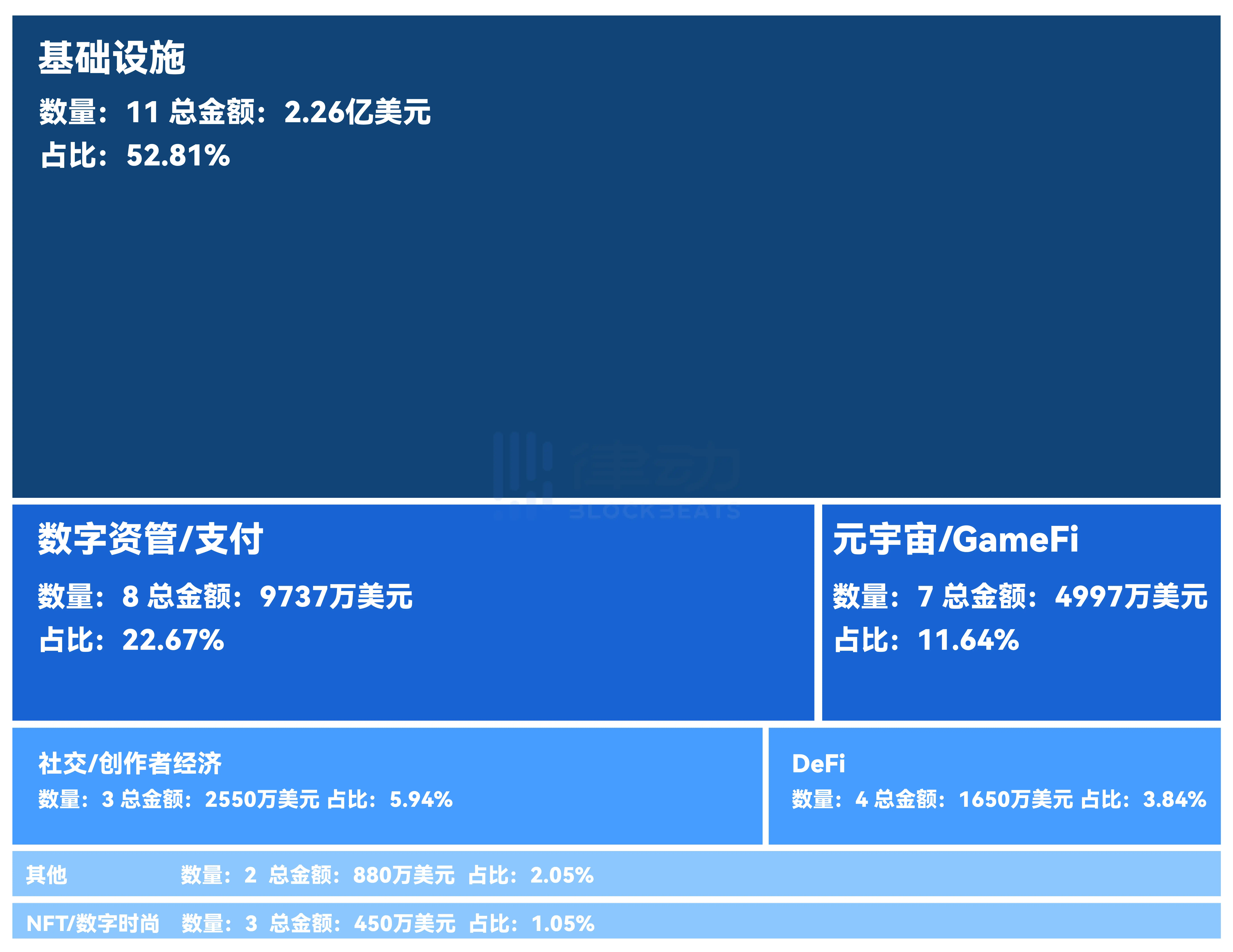 据 BlockBeats 统计,上周融资总数为 38 笔,数量较上周有一定提升,总金额约 3.5 亿美元,平均融资金额为 1057 万美元,较上周均有明显提升。其中,基础设施领域占据主体,数字资产管理/支付和元宇宙/GameFi 领域的融资相对较多,社交板块融资保持高位,DeFi、NFT 领域融资较少。下图为上周各板块融资占比: