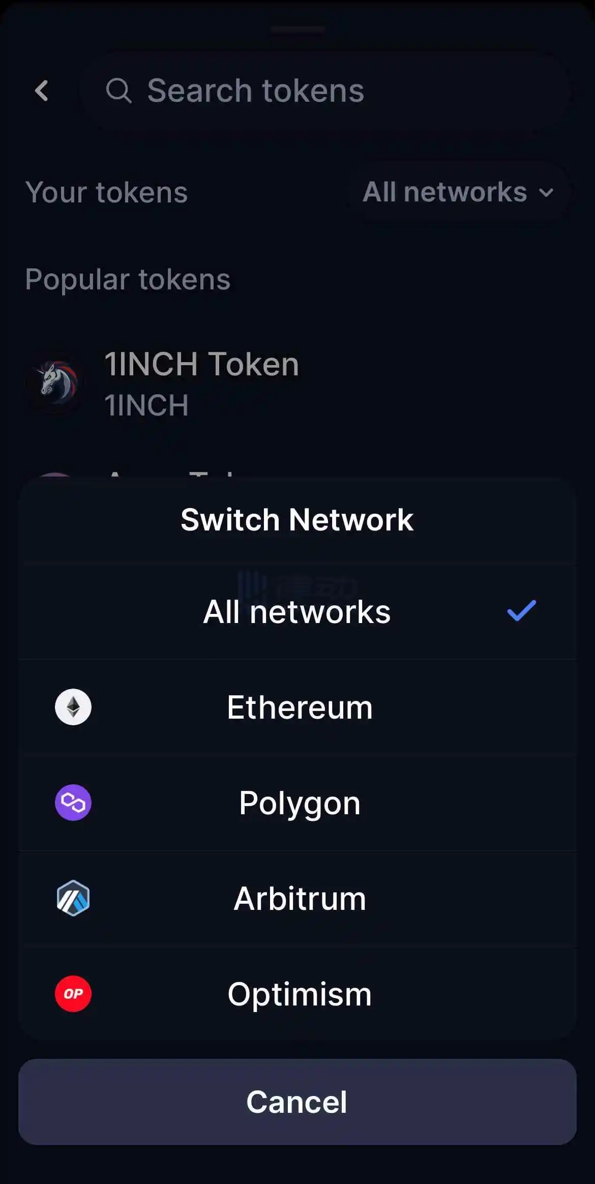 作为 Uniswap 的本职工作,Swap 功能体验还是很流畅的。点击选择要交易的 Token 界面可以选择交易网络,支持以太坊主网、Polygon、Arbitrum 以及 Optimism 网络。值得指出的是,当前版本钱包暂不支持 NFT 交易。