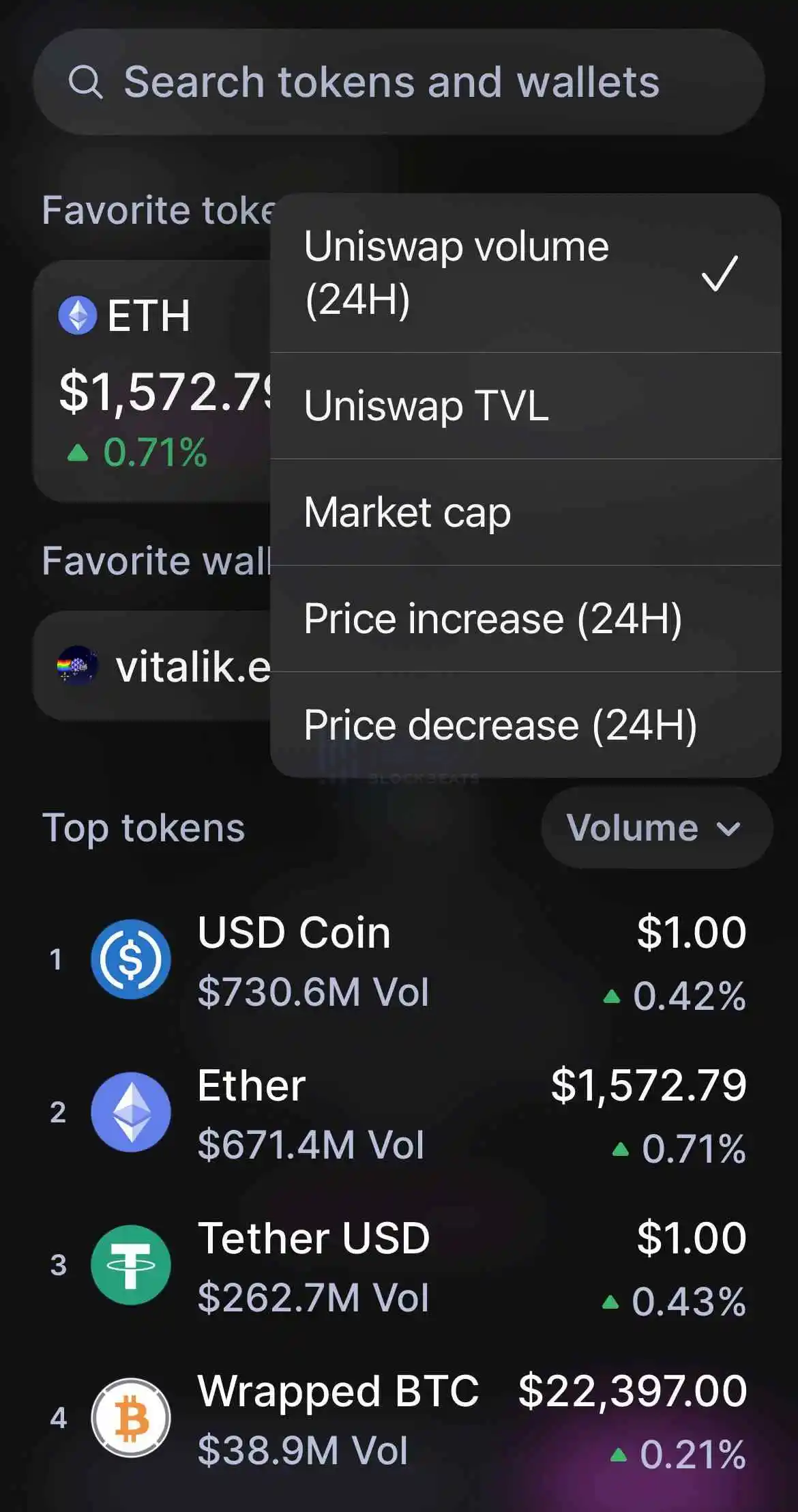 可以说 Web3 浏览器界面与 Uniswap 整合的十分彻底,Top tokens 显示可按照 Uniswap 上的成交额和 TVL 进行排名。支持已关注 Token 和地址展示。