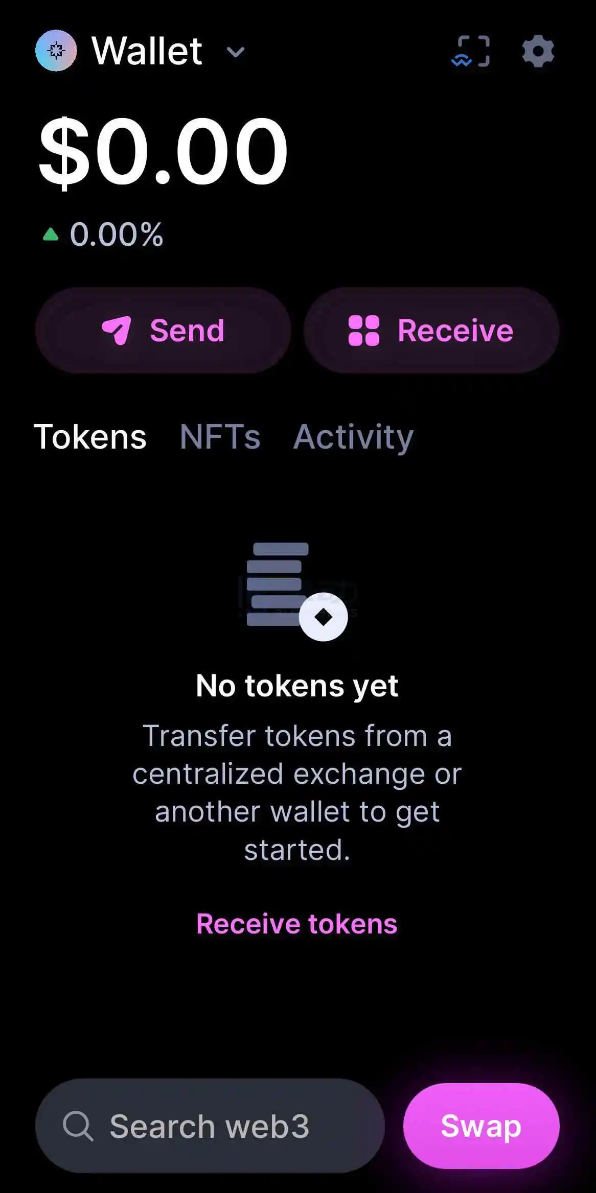 钱包创建完成后,便进入钱包的主界面。作为内测版,可以说该钱包的功能是比较完整的:基本的 Token 收发、支持 WalletConnect、Portfolio(持仓 ERC-20、NFT 以及交易记录)展示、Swap 以及 Web3 浏览器。