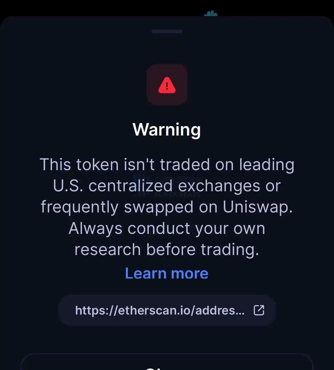 此外,针对部分 Token,钱包也会做出如下风险警示,提示用户「该 Token 未在美国头部 CEX 上架或者频繁交易」。