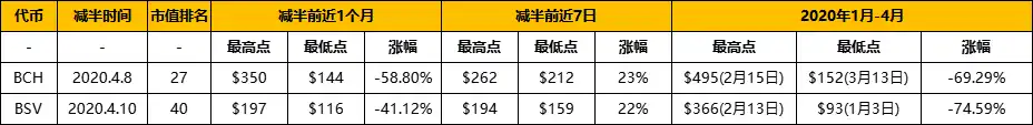 BCH 和 BSV 只有一次减半历史,目前还没有好的规律可参照,但是作为分叉 Token,没有完善的生态以及需求,未来的上涨空间不会很大,并且过去几年,市值排名前 10 的 Token,已经淘汰了 BCH、BSV,炒作预期相对较低。