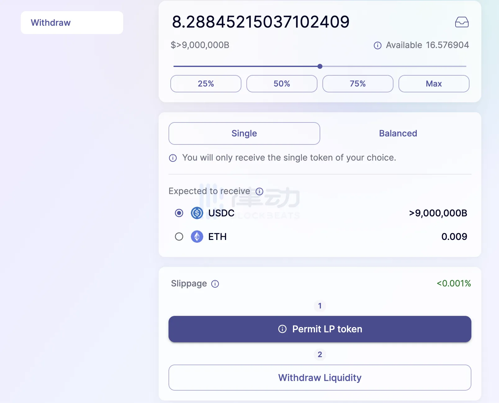 接下来切换到 Withdraw,依次点击 Permit LP token、Withdraw Liquidity(移除流动性),当然只需要移除一部分就可以,并在钱包中确认。