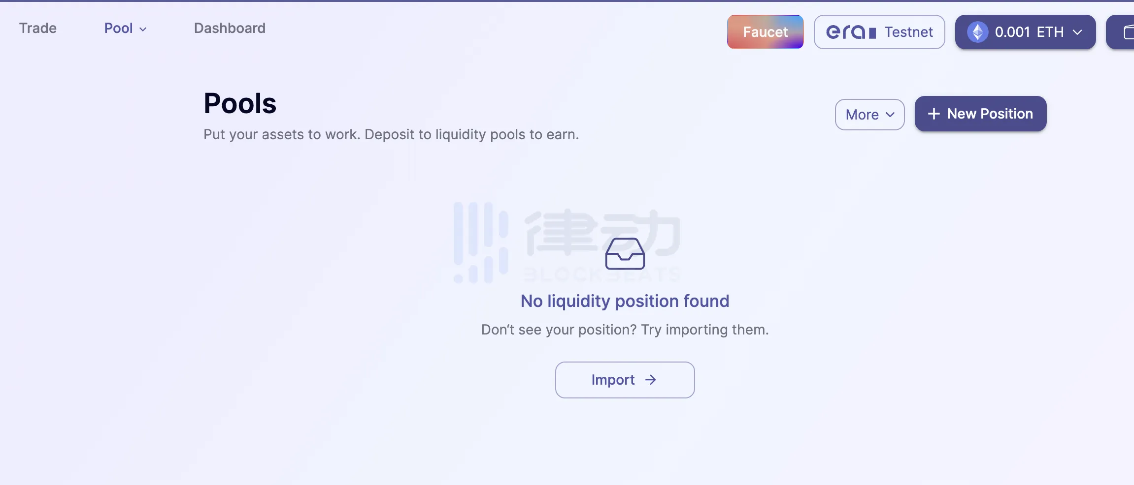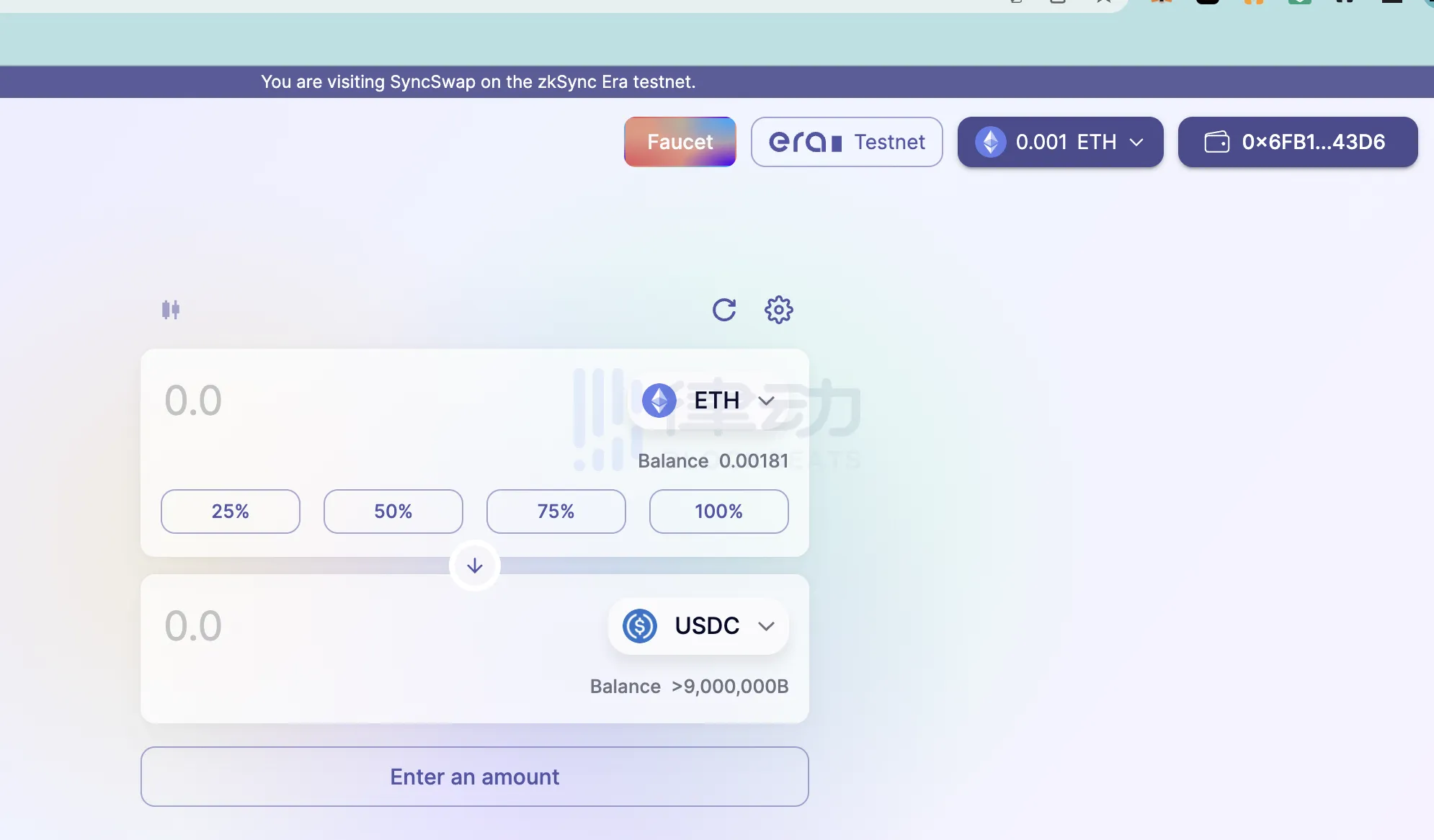 当然,SyncSwap 官网也可以点击 Faucet 领取测试币,前提是钱包里需要有 Gas 才可以成功领取。