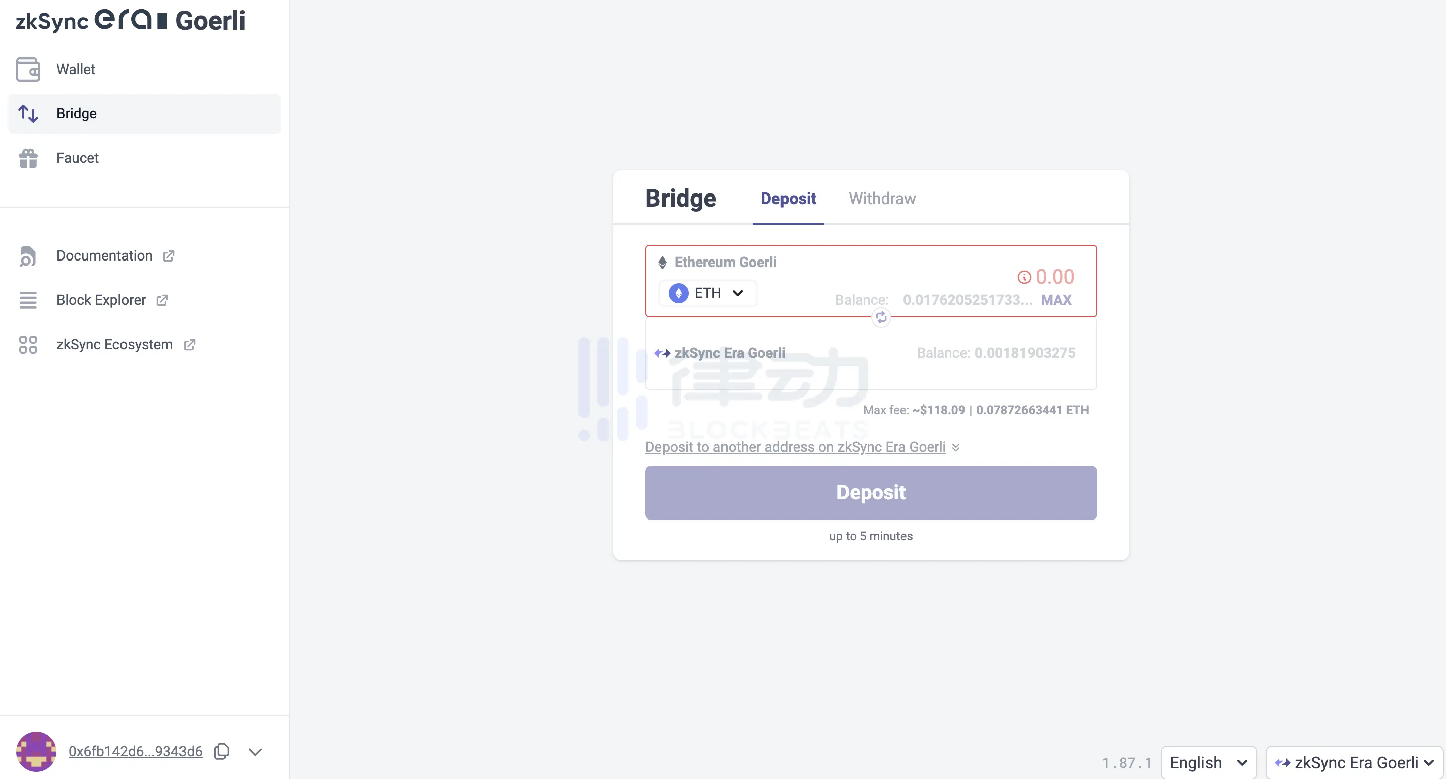 若第一种方法无法领取,另一个方法就是通过 zkSync Era Goerli 官桥从 ETH Goerli 跨桥到 zkSync Era testnet,注意跨桥 Gas 较高,过程需要约 5min。