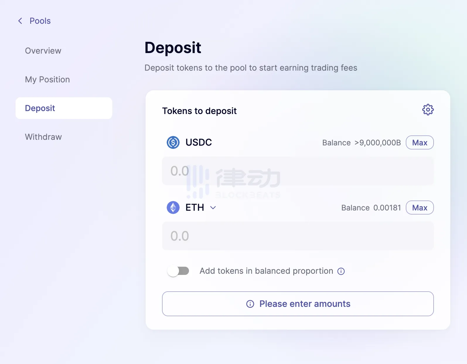 点击 Deposit 存入 ETH 与 USDC,添加流动性。