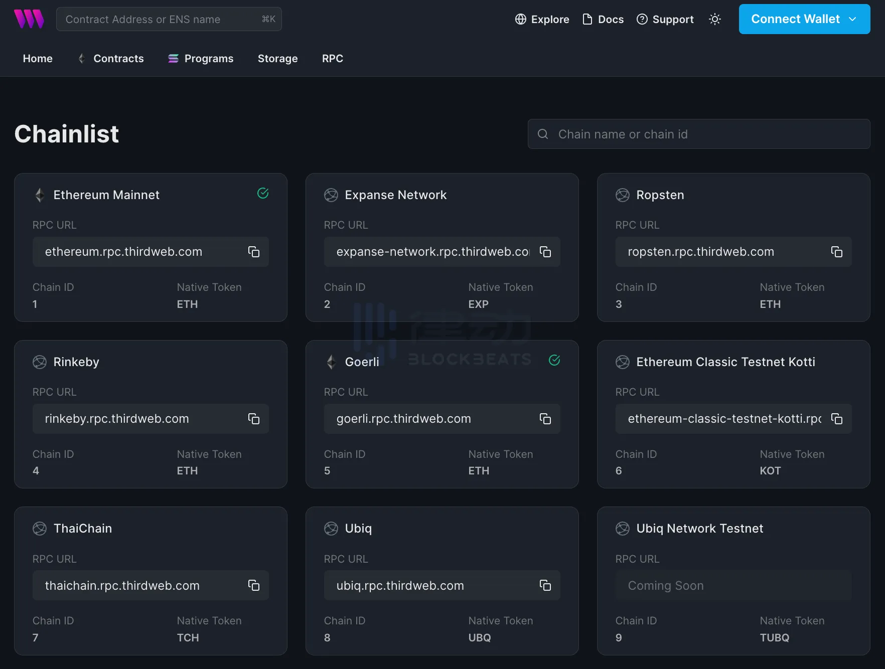 Thirdweb 目前支持的链已从 7 条链增加到 700 多条,为跨越所有 EVM 兼容区块链的开发者生态系统解锁工具,支持的所有链显示在 Thirdweb 的 Chainlist 中: