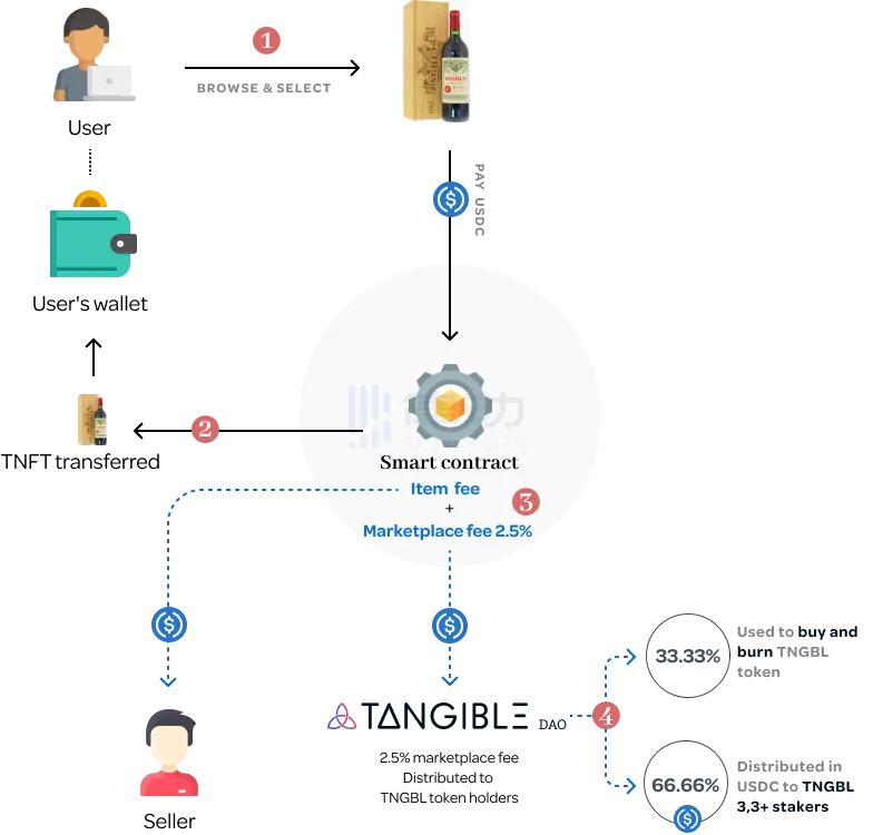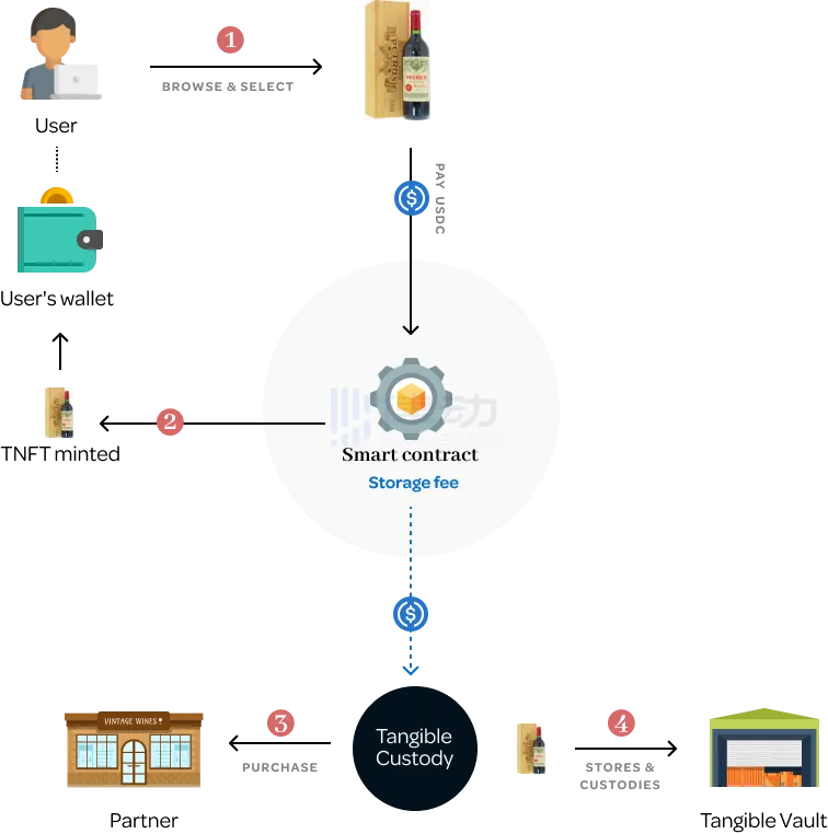 1. 用户在 Tangible 市场上使用 USDC 购买实物,支付完成后 Tangible 的智能合约将铸造与该物品对应的 TNFT;
