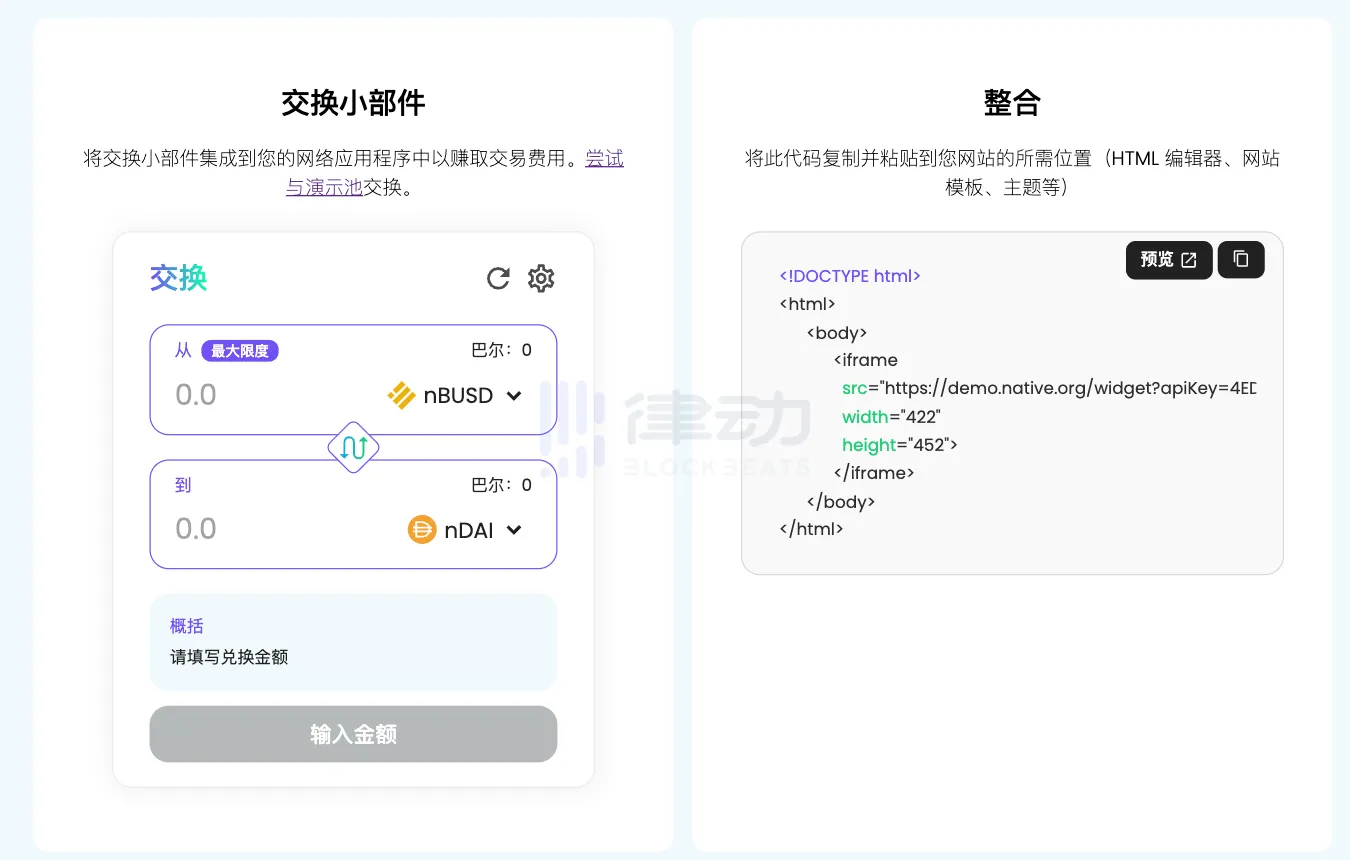 交换小部件是 GUI 最终用户将用来执行他们的交换。它将集成到每个项目自己的应用程序或网站中。项目团队可以选择使用 Native 创建的默认交换小部件,或者使用 Native SDK 或 API 创建他们的自定义小部件。每个项目都有自己的交换小部件;这些小部件通过它们的 API 密钥来区分。