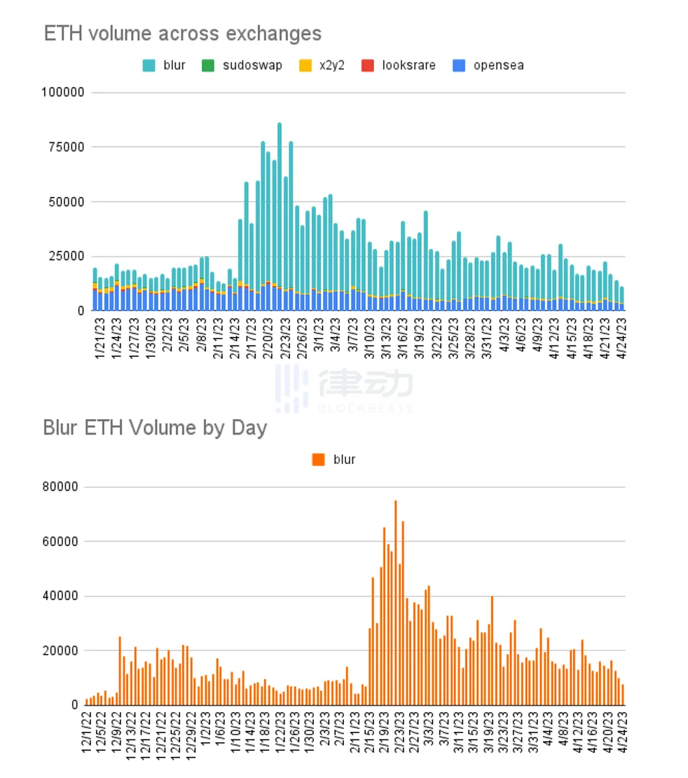 Blur 自身乃至各 NFT 市场的 ETH 交易总量都在不断下滑(来源:@punk9059)