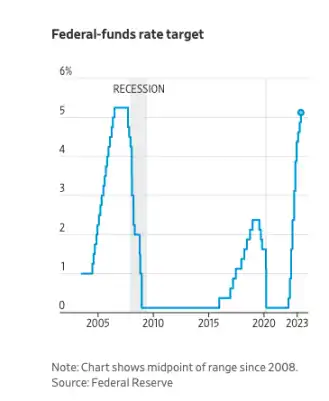 周三的加息将关键利率上调至 5% 至 5.25%,为 17 年来的最高水平。美联储在接近创纪录的时间内实现了这一目标,在 2022 年 3 月将利率从接近零的水平上调,以试图遏制通胀,随着美国经济迅速从 Covid 大流行中复苏,通胀在去年 6 月也达到了十年来的最高水平。