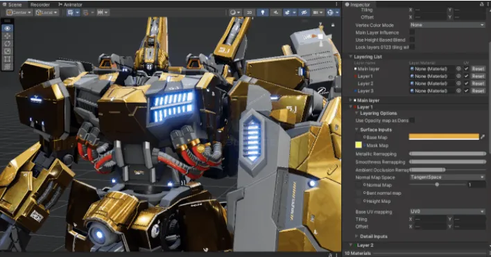 由于《Fusionist》项目的机甲模型需要一套不同材质和颜色变化的 Avatar 系统,开发团队在经过测试和讨论后决定采用 HDRP 独有的分层 Lit 材质,该材质球虽然是系统自带材质球,但是依然可以很好地满足游戏需要的效果。