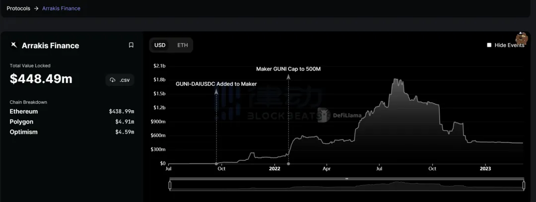 集中流动性协议下,LP 一般都会选择是市场价格附近提供流动性,但当市场价超出策略范围时,LP 不仅面临着无常损失还会无法再赚取 LP 费用,LP 需要再次主动部署做市策略。自动化流动性管理协议应运而生,它可以帮助 LP 自动执行做市策略。头部项目如 Arrakis Finance 的 TVL 已经达到 4.4 亿美金。