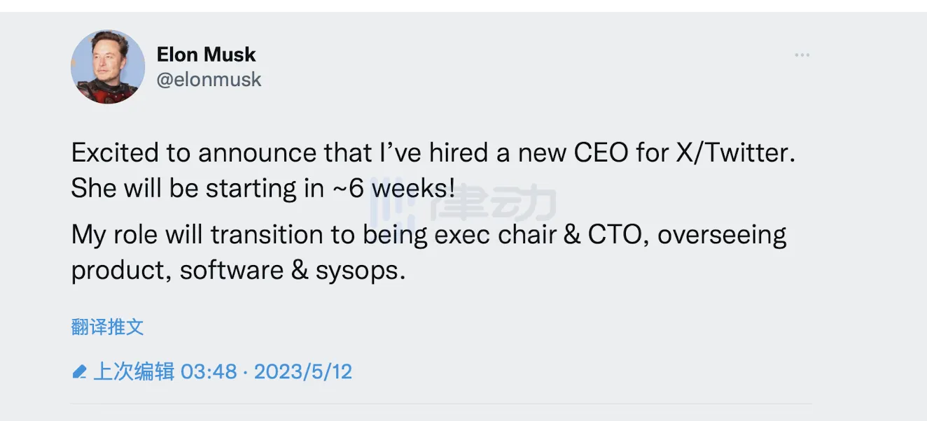 今日,马斯克在社交媒体宣布即将为 twitter 聘请一位新任 CEO,而自己将成为执行主席兼 CTO,负责监督产品、软件和系统等,字里行间不难看出 twitter 新任 CEO 是一位女性,即将在 6 周后正式成为 twitter 新任 CEO。