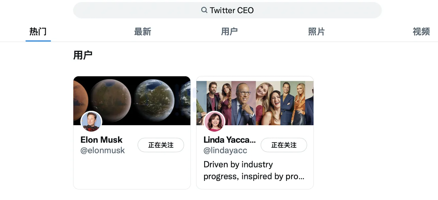 若是在 twitter 公开搜索 「Twitter CEO」,Linda 的账号赫然在列,与马斯克并排,成为 twitter 新任 CEO 似乎板上钉钉?