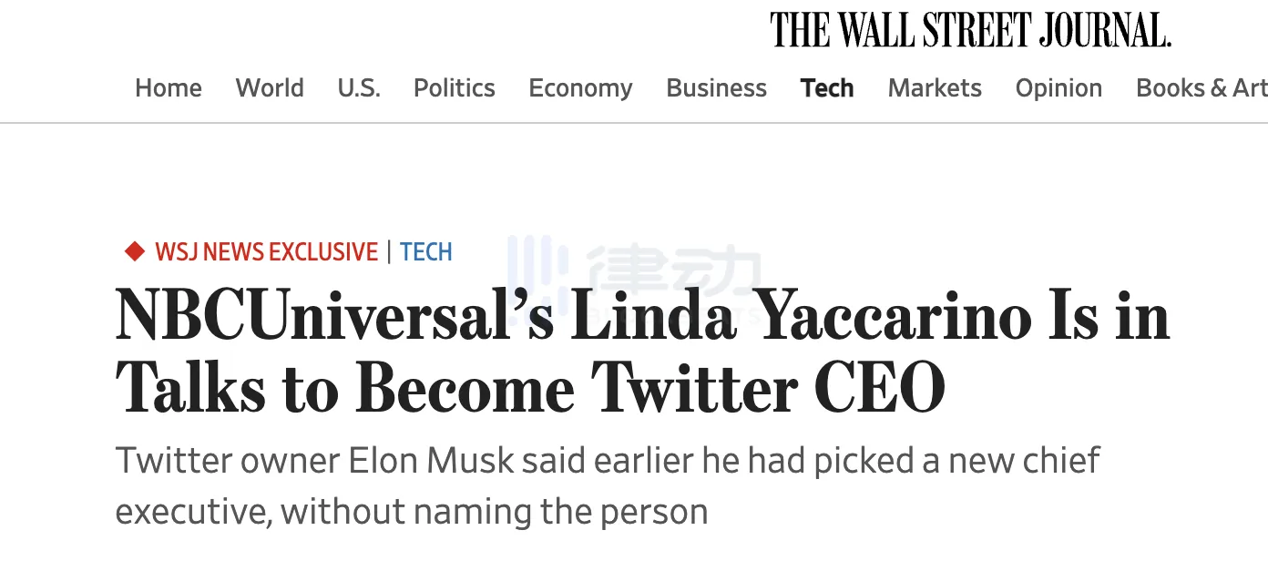 有意思的是,马斯克并未透露过多关于这位新 CEO 的信息,但随后《华尔街日报》刊文表示:知情人士透露,NBC 环球公司广告主管 Linda Yaccarino 正商讨成为 Twitter 新任 CEO 的相关事宜。