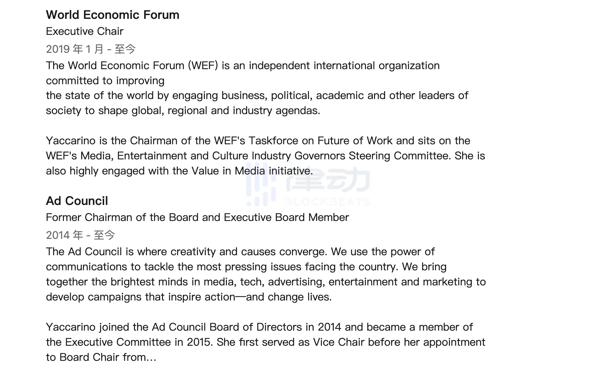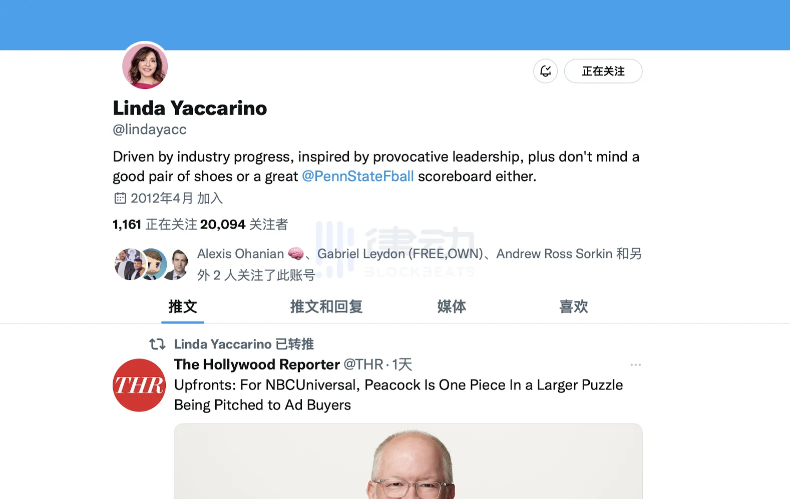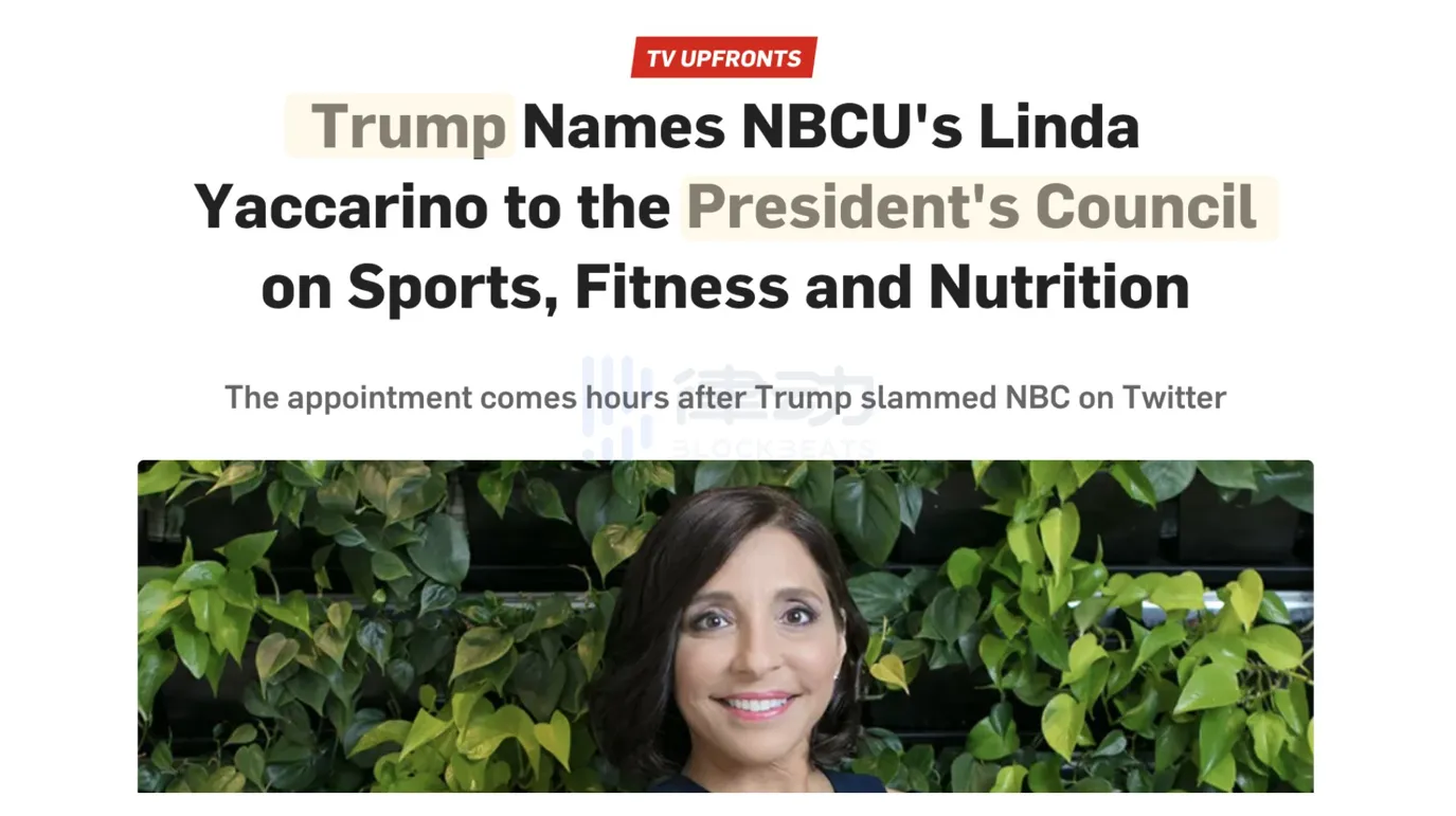 大家对 Linda 可能不太熟悉,BlockBeats 查找了关于 Linda Yaccarin 的工作经历,Linda 现任职于 NBC 环球公司(NBCU),NBCU 是一家美国传媒公司,略偏向娱乐新闻,为读者提供有关娱乐、新闻和资讯的产品和服务。
