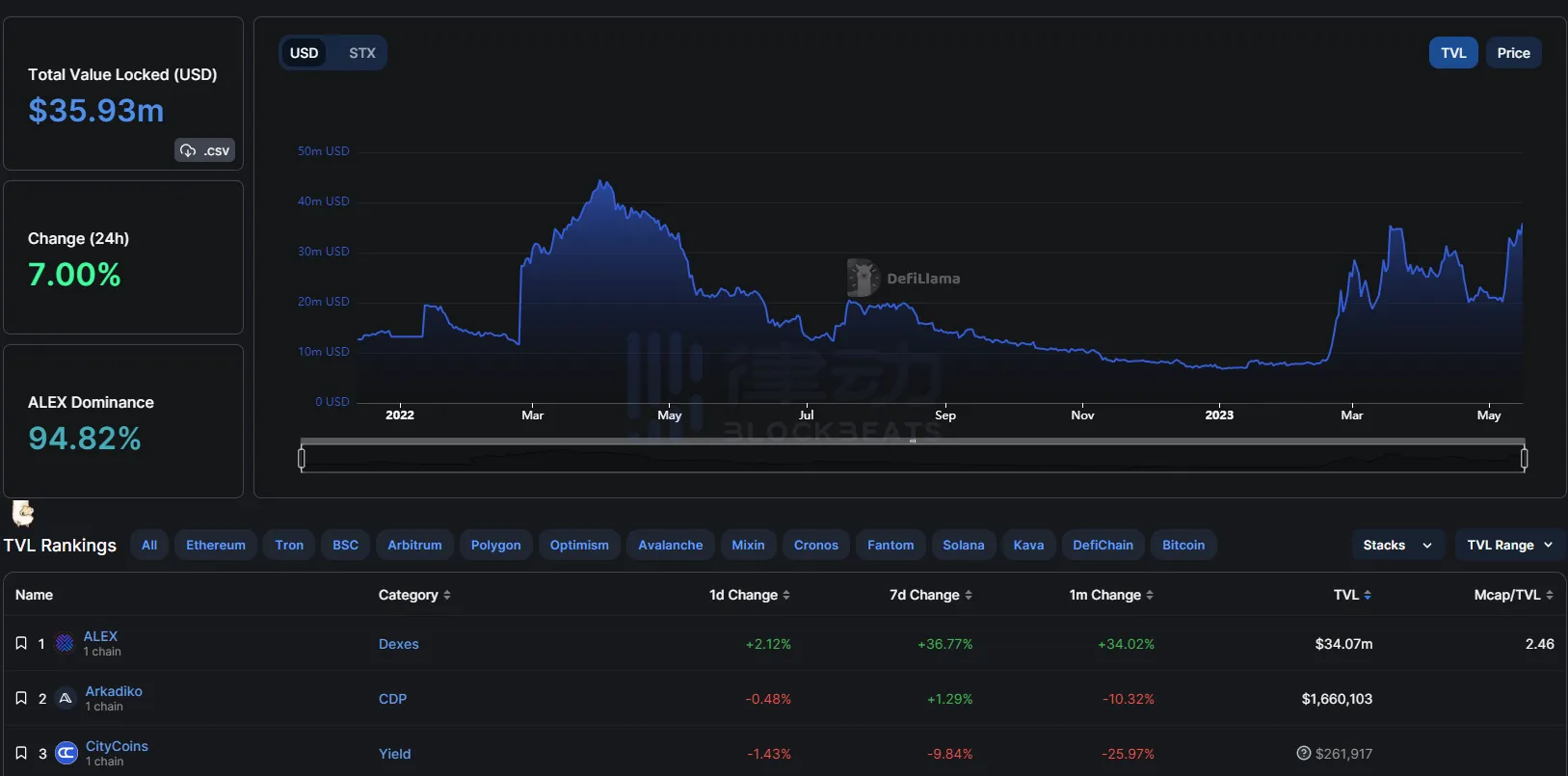 当前 Stacks TVL 约为 3600 万美元,其中去中心化交易平台 ALEX(TVL 约为 3400 万美元)为主要 TVL 贡献方。Stacks 允许利用比特币作为基础结算层来构建去中心化和抗审查的软件。最终目标是建立一个金融系统和去中心化软件产品的网络,这些产品都使用比特币作为他们的货币。目前生态系统的最高优先级是将 Stacks 与比特币更紧密地集成,以便轻松地与 Stacks dapps 一起使用。