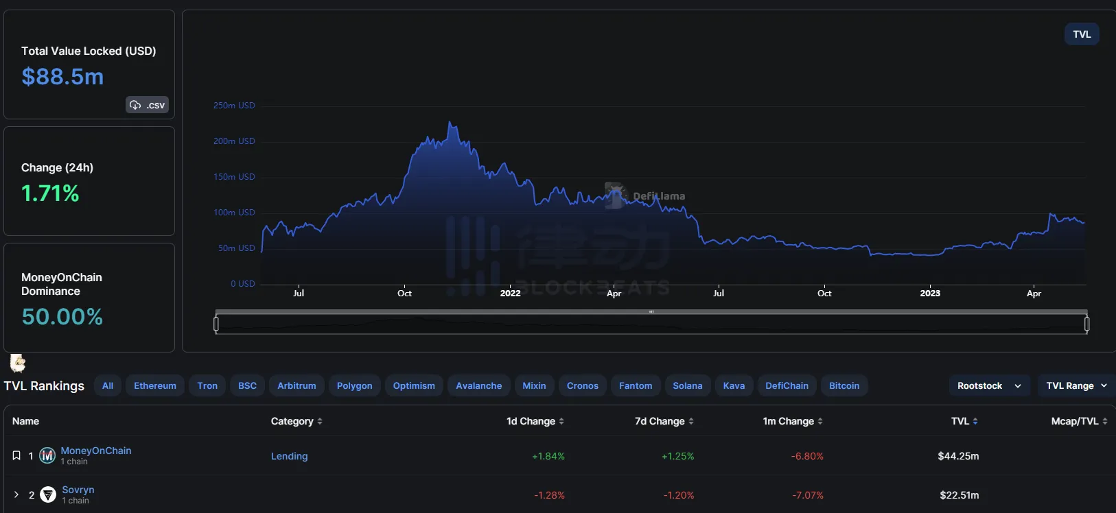 当前 Rootstock TVL 约为 8850 万美元,其中借贷协议 MoneyOnChain TVL 约为 4425 万美元,Sovryn TVL 约为 2250 万美元。