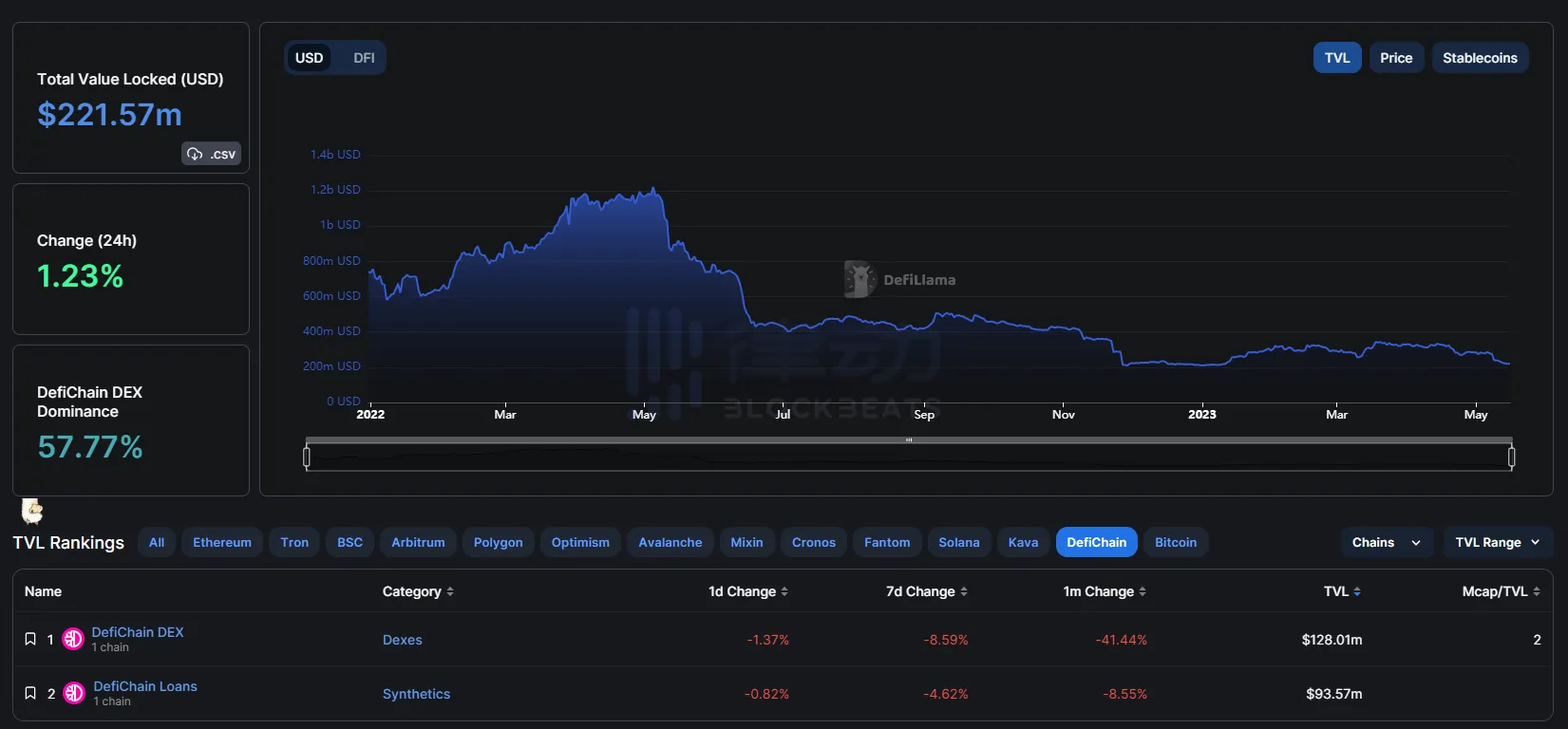 据 DefiLlama 数据显示,当前 DeFiChain TVL 约为 2.21 亿美元。DFI 是 DeFiChain 平台的原生 Token,可用于支付 DeFiChain 的网络费用,赚取贷款利息,并参与治理。平台无需许可,任何人都可以参与其生态系统。