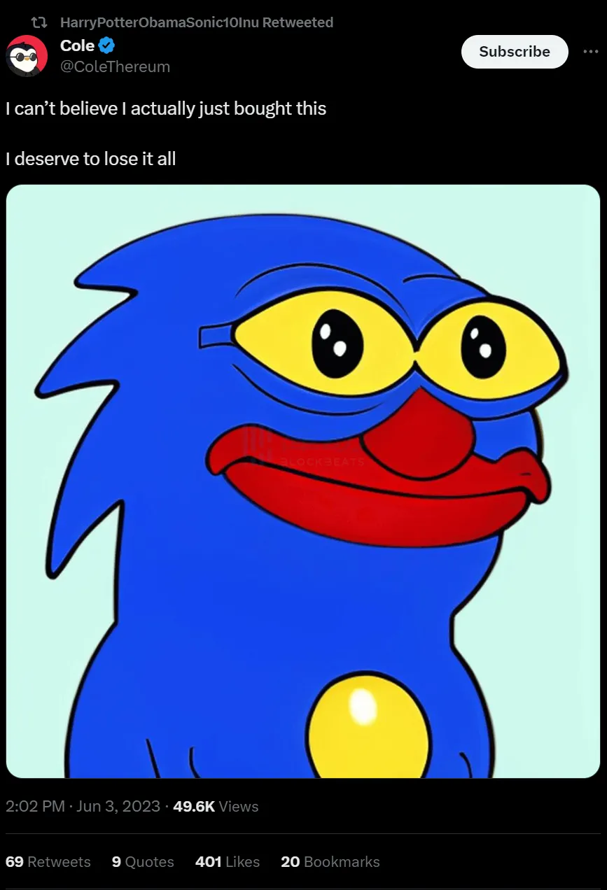 Pudgy Penguins 的创始人 @ColeThereum 在 6 月 3 日购入了「缝合怪」:
