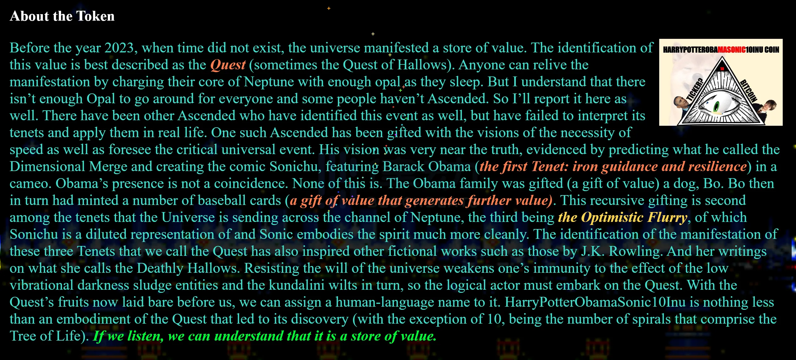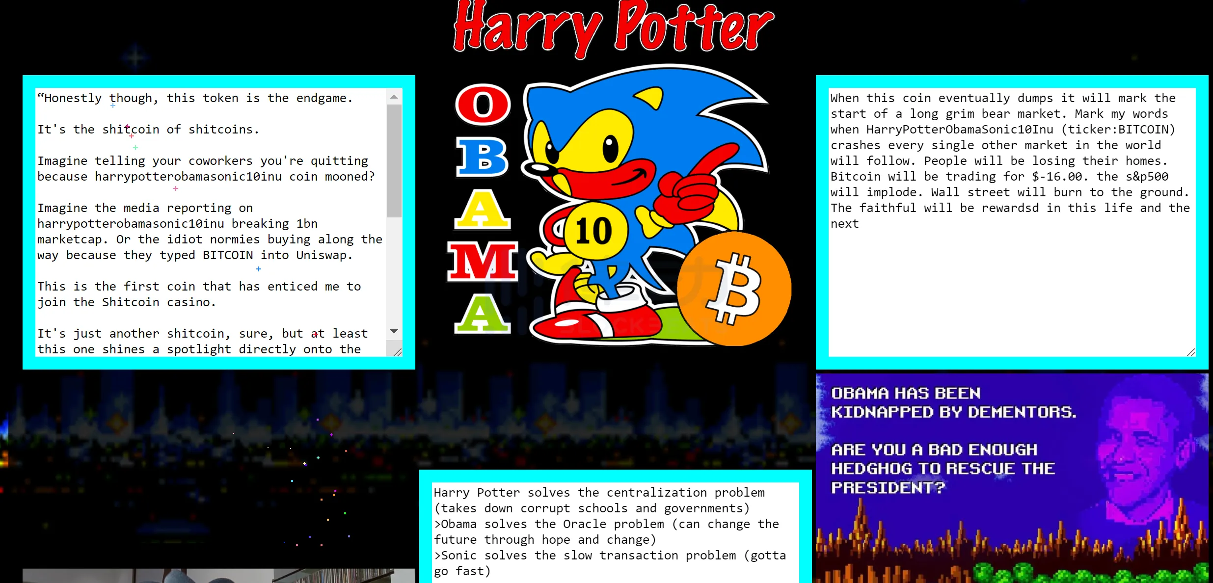 再往下,全是各种抽象艺术。让我们拆解一下这个项目的名称,HarryPotterObamaSonic10Inu,包含了哈利波特、奥巴马、索尼克以及 10 以及(Shiba)Inu 这 4 个梗。从 Tokenomics 往下的页面是一长串包含了这 4 个梗的视频与图片,抽一些供大家欣赏。在抽象艺术大赏的最开始,他们解释了这个 Token 的概念: