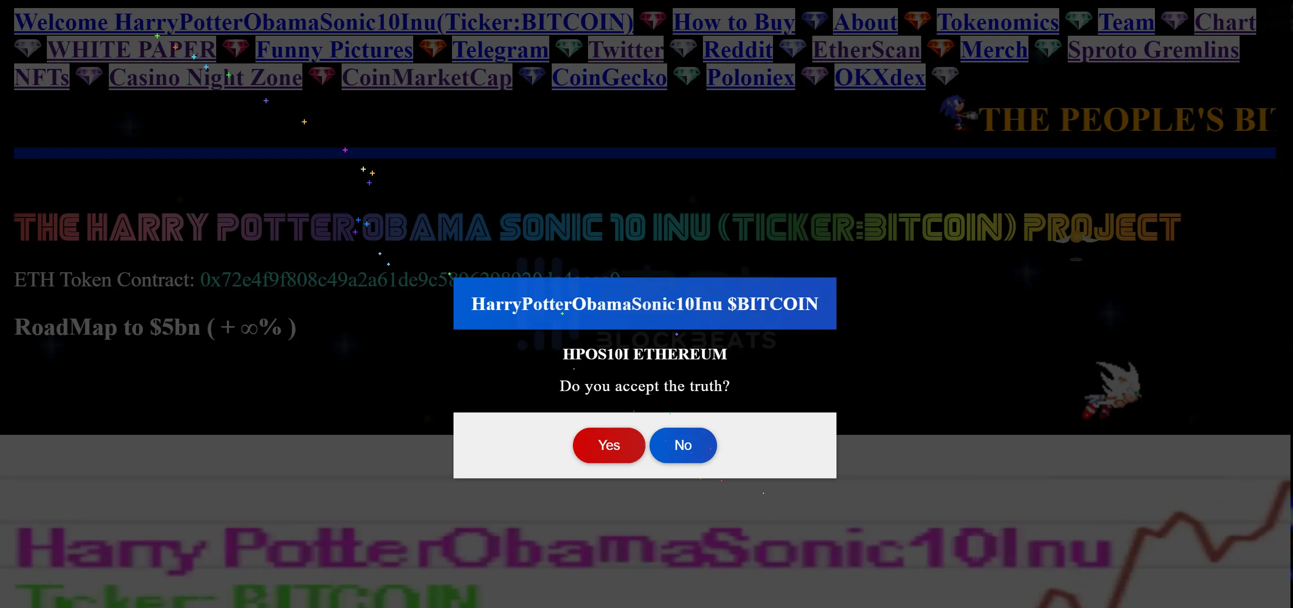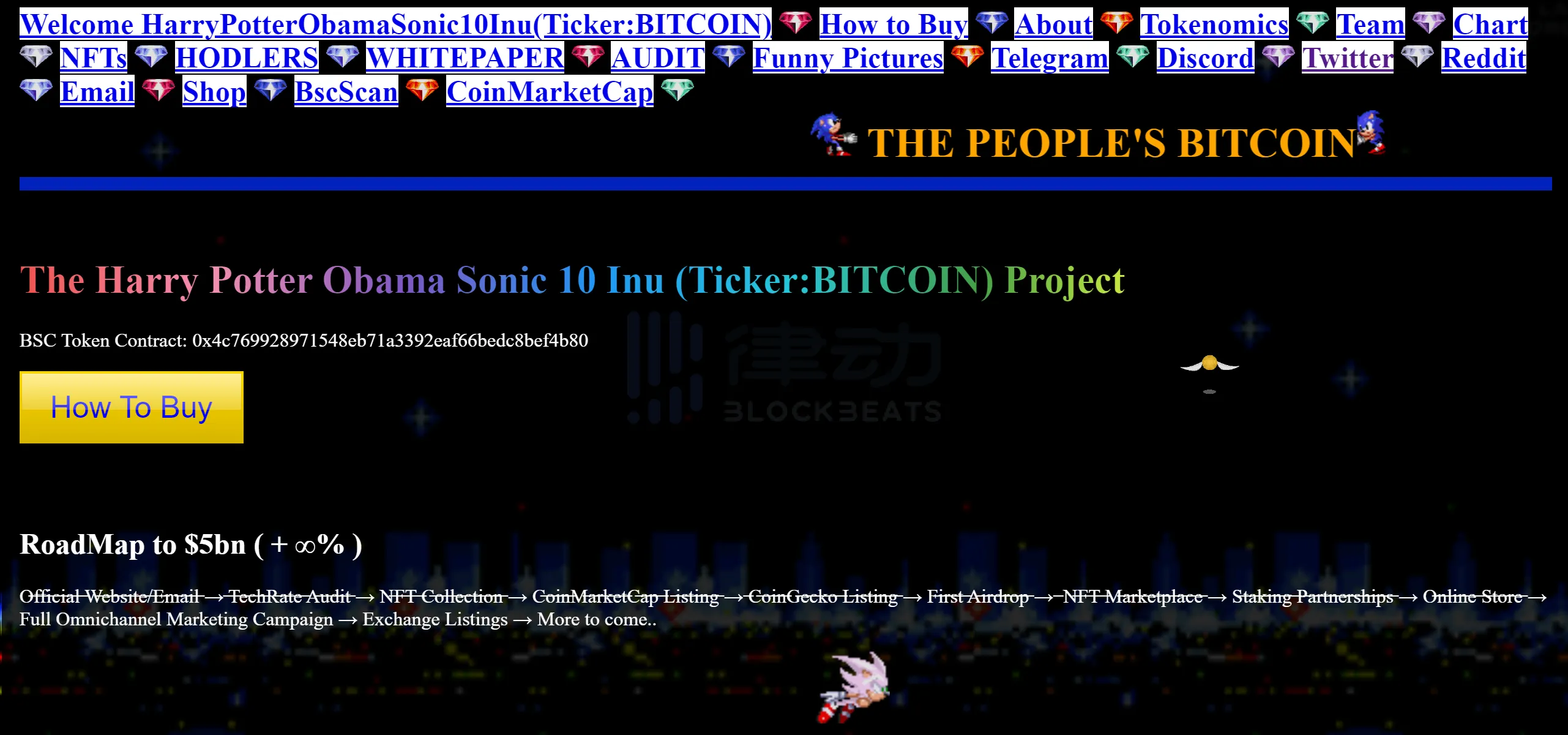 留在官网以后我们可以继续欣赏「抽象意识流」打法了,看看这个复古的导航栏,梦回千禧年初。顺带还解释一下为什么比特币是个谎言?因为我们 HarryPotterObamaSonic10Inu 才是「人民的比特币」。
