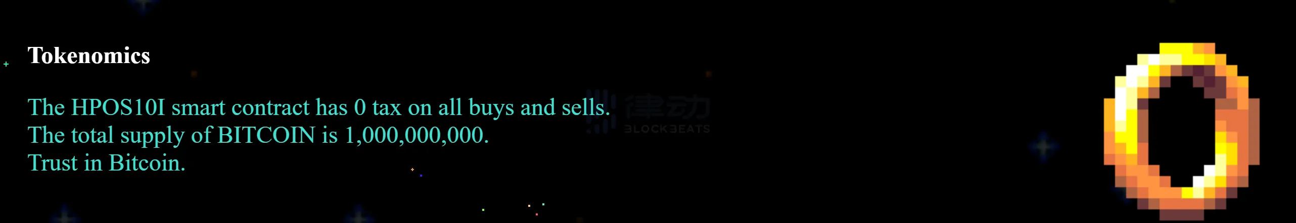再接着,Tokenomics 介绍,$BITCOIN 总量 10 亿个,买入卖出都不收税。旁边索尼克游戏中的金环不断 360° 旋转,我不禁冒出一句,哥们,你家索尼克吃的金环真多...