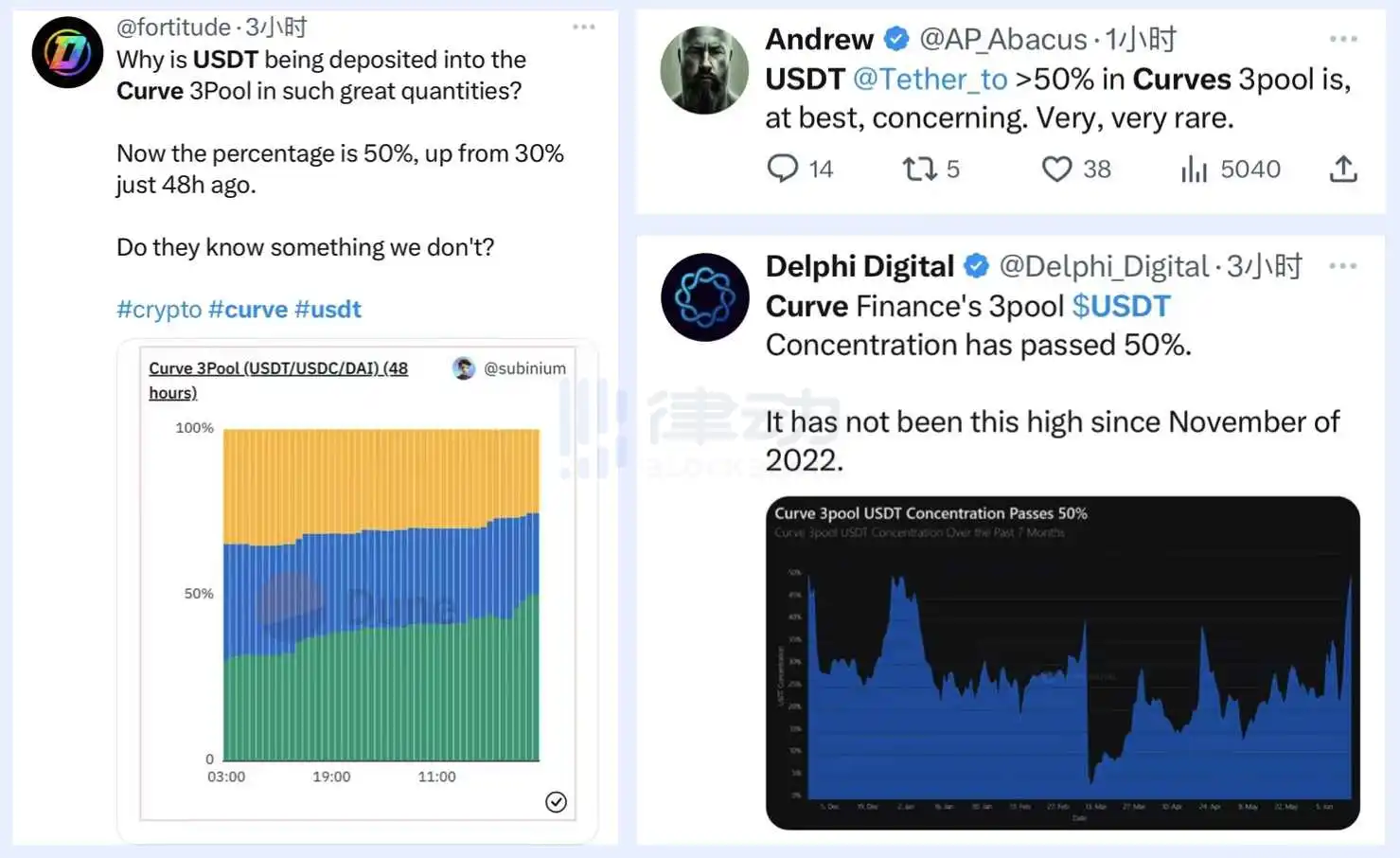 而在过去最近 48 小时里,Curve 3pool 中的 USDT 集中度上升至了 50%,又在仅仅一个小时内又从 50% 急剧上升到了 74%。这引发了社区的担忧,大家似乎都对 USDT 突如其来的抛压有些摸不着头脑。难道是有人提前知道了一些关键信息?毕竟上一次 Curve 3pool 中的 USDT 集中度超过 50%,是在 2022 年 11 月 FTX 崩盘之时,自那之后 USDT 集中度就再未达到如此高的程度了。