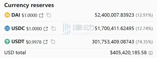 根据数据显示,在过去的 24 小时内,共有 9900 万枚 USDT 在 Curve 的 3pool 中售出,净流出达到 6440 万美元。而在过去的 3 天内,共有 2.05 亿枚 USDT 在 3pool 中被售出,净流出金额则达到了 1.3 亿美元。同时根据 Curve 官方的最新数据显示,截至撰稿时,3pool 中 USDT 的占比已经达到了 74%,共计 301,753,409 枚。而 DAI 和 USDC 的占比分别为 12.91% 和 12.74%。