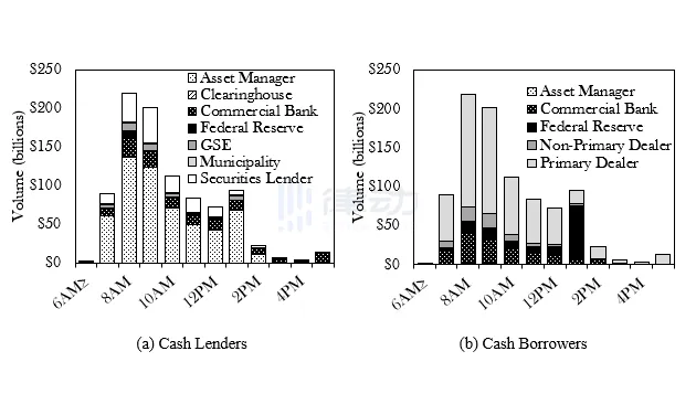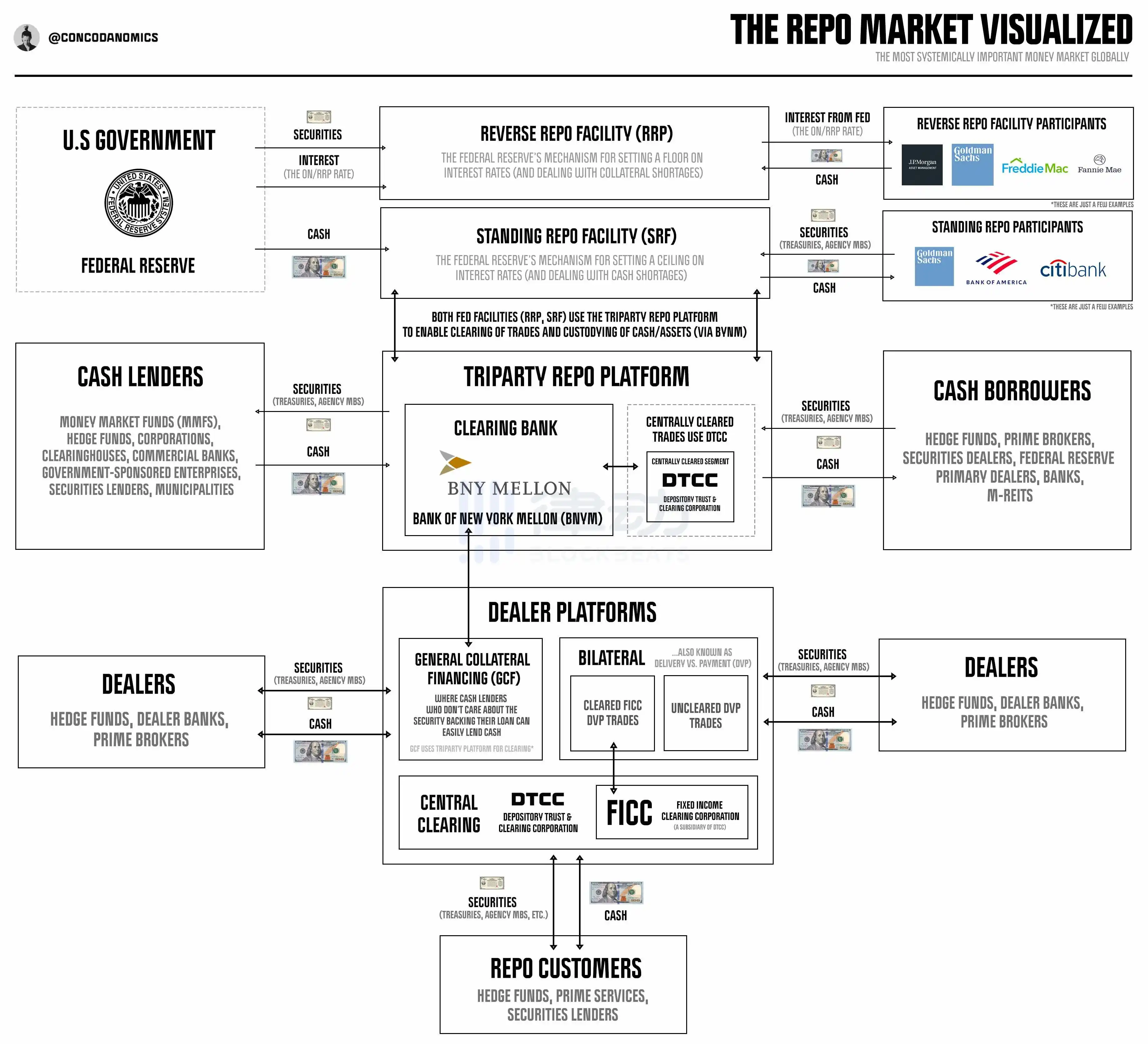 回购市场包含多个部分,每个部分在提供流动性方面都发挥着独特的作用。在顶部,三方回购允许现金贷款方(主要是资产管理公司,如 MMFs)主要向美联储的主要交易商提供贷款,而这些交易商的任务是将现金分配给回购市场的其他部分。