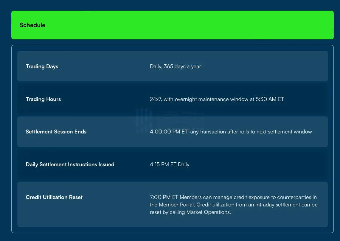 EDX 官网对平台的交易技术和市场数据有详细的描述文档,了解详情可前往官网查看。同时,与传统金融交易平台相似,EDX 设有相对固定的交易、结算时间,以及相对固定的交易类型。详情见下图。