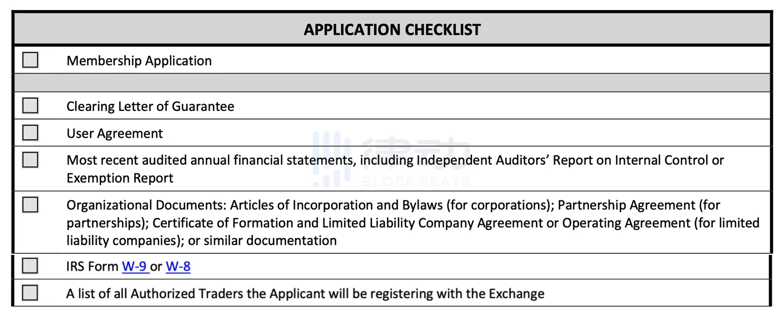 为了成为 EDX Markets LLC(「EDX Markets」或「交易所」)的会员,申请人(「申请人」)必须填写并提交申请清单上列出的所有材料,并通过电子邮件发送至 EDX 官方 Onboarding 邮箱(onboarding@edxmarkets.com)。所有签名表格原件则必须发送至 EDX 首席合规官所在地(新泽西州泽西市,哈德逊街 101 号 21 楼,07302)如果申请人正在寻求零售会员组织的会员资格,则需要填写补充表格。
