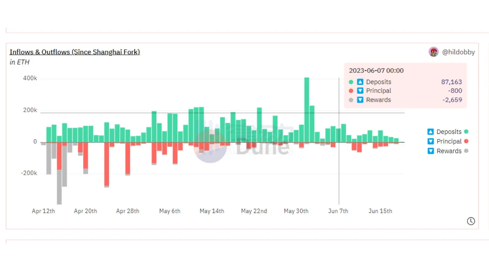 自从以太坊 Shapella(Shapella = Shanghai + Capella)升级以来,Ethereum 的质押一直在增加,总质押的 $ETH 数量从以太坊上海升级前的 15.3% 增长到了 19.2%。与此同时,在 @LidoFinance V2 推出后,信标链(beacon chain)收到了大量的存款。