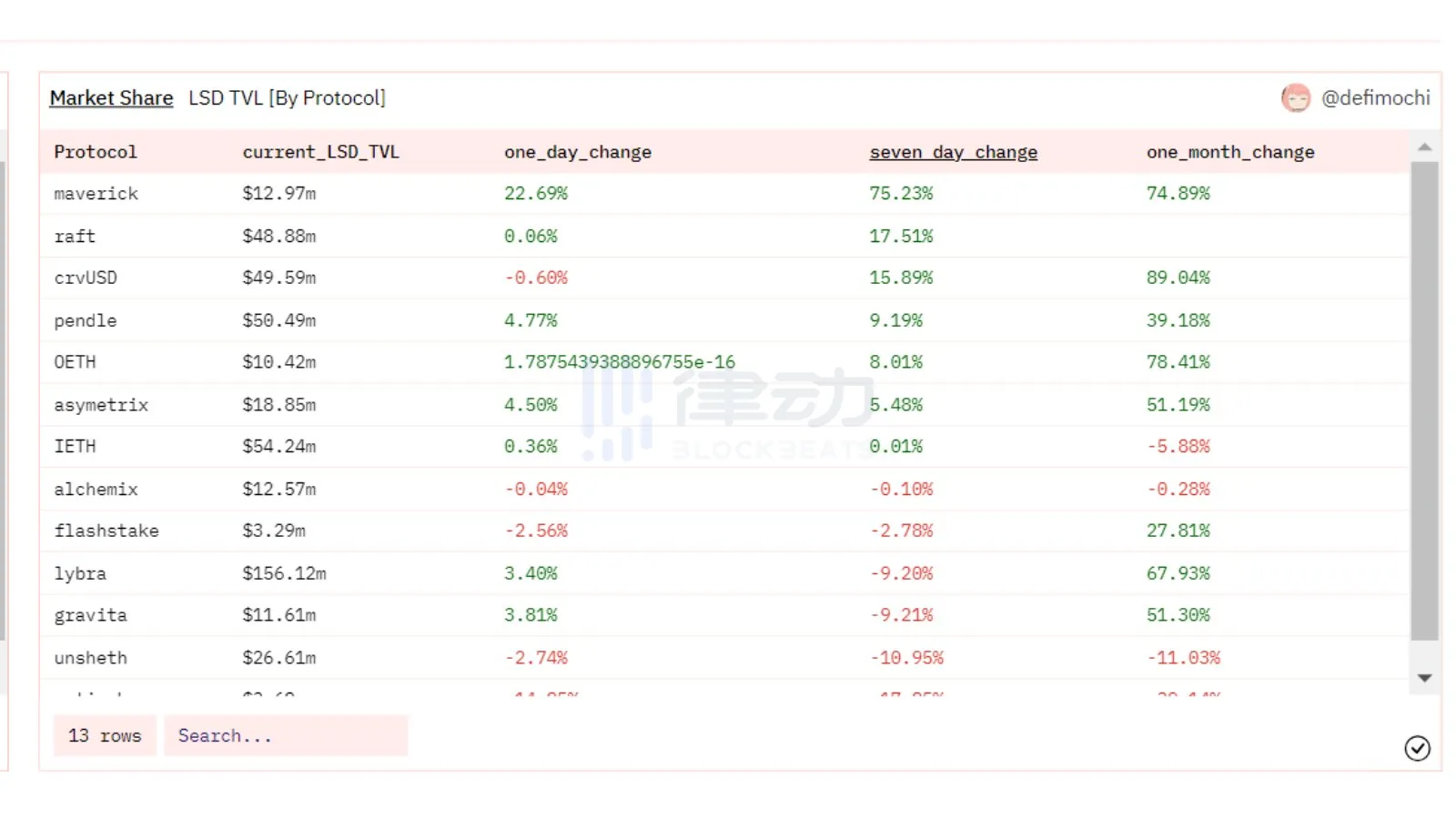 自从 Mochi 发布这个仪表盘以来还不到一个月的时间,LSDfi 的 TVL 已经几周内从 2 亿美元增长到了超过 4 亿美元,包括 Swell,Maverick Protocol 和 Raft 等新协议。