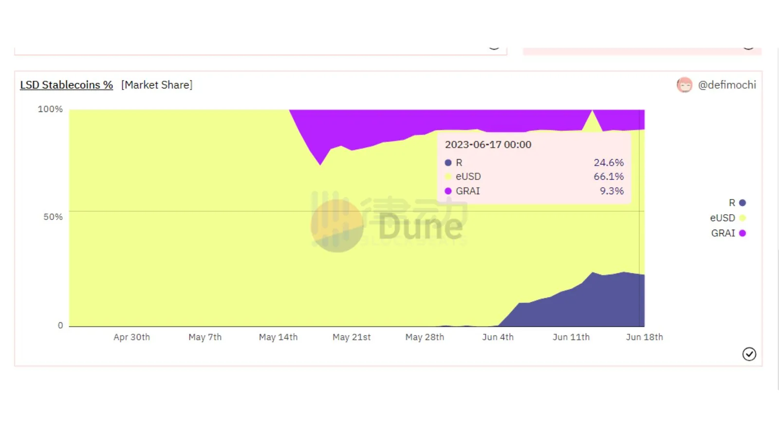 在 LSDfi 稳定币中,Raft 的$R 已经迅速抢占了 24% 的市场份额,而$GRAI 的流通量有所下降。请注意,这个图表中并未包含$crvUSD。