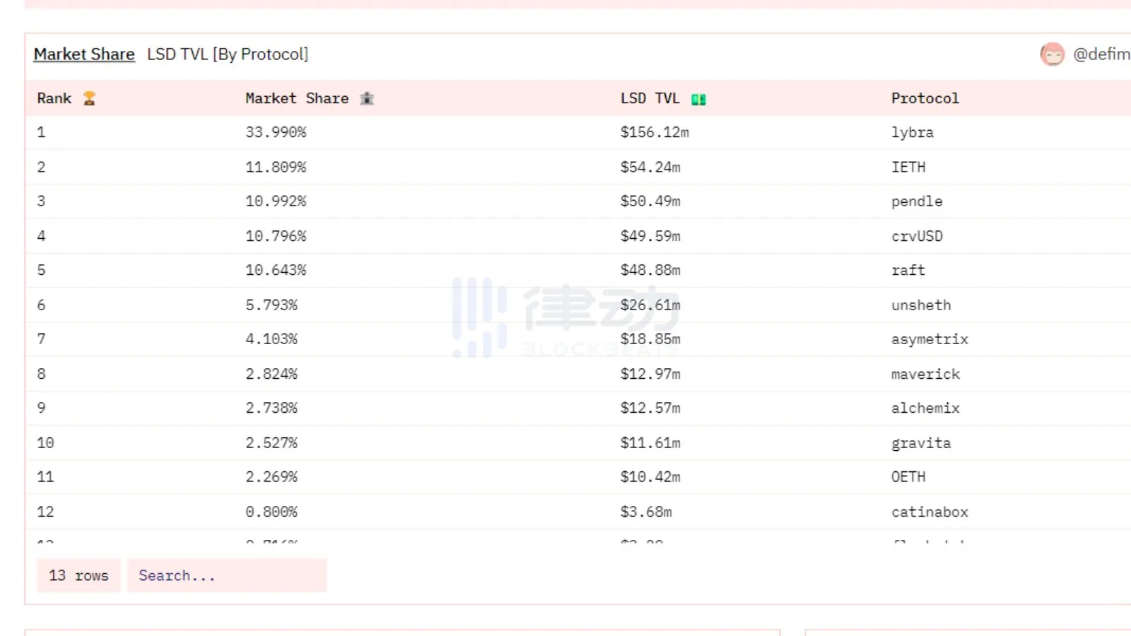 在 LSDfi 市场份额方面,令人惊讶的是 Lybra Finance 仍然位居榜首,尽管其 Token 价格下跌超过 80%,这暗示了更为健康的发行情况。同时,在六月初刚刚启动的 Raft 已经进入前五,其 $stETH 的总价值超过 4800 万美元。
