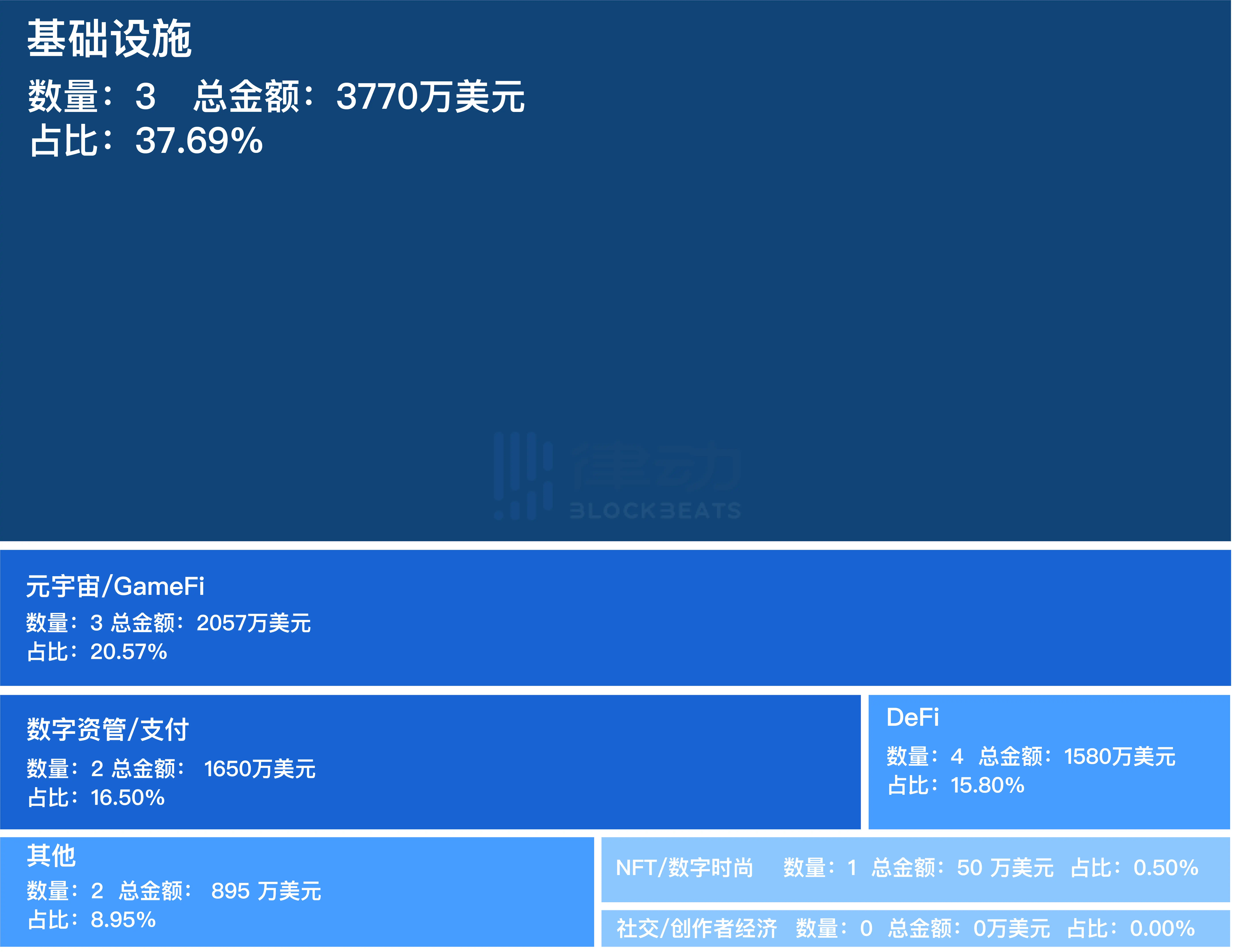 据 BlockBeats 统计,上周的融资总数为 15 笔,数量较之前持平,总金额有所下降约 10002 万美元,平均融资金额为 666.8 万美元。其中,基础设施领域占据主体,元宇宙/GameFi 和数字资管/支付领域融资相对较多,DeFi 领域有所增加,其他领域有所下降,NFT/数字时尚和社交/创作者经济领域较少。下图为上周各板块融资占比: