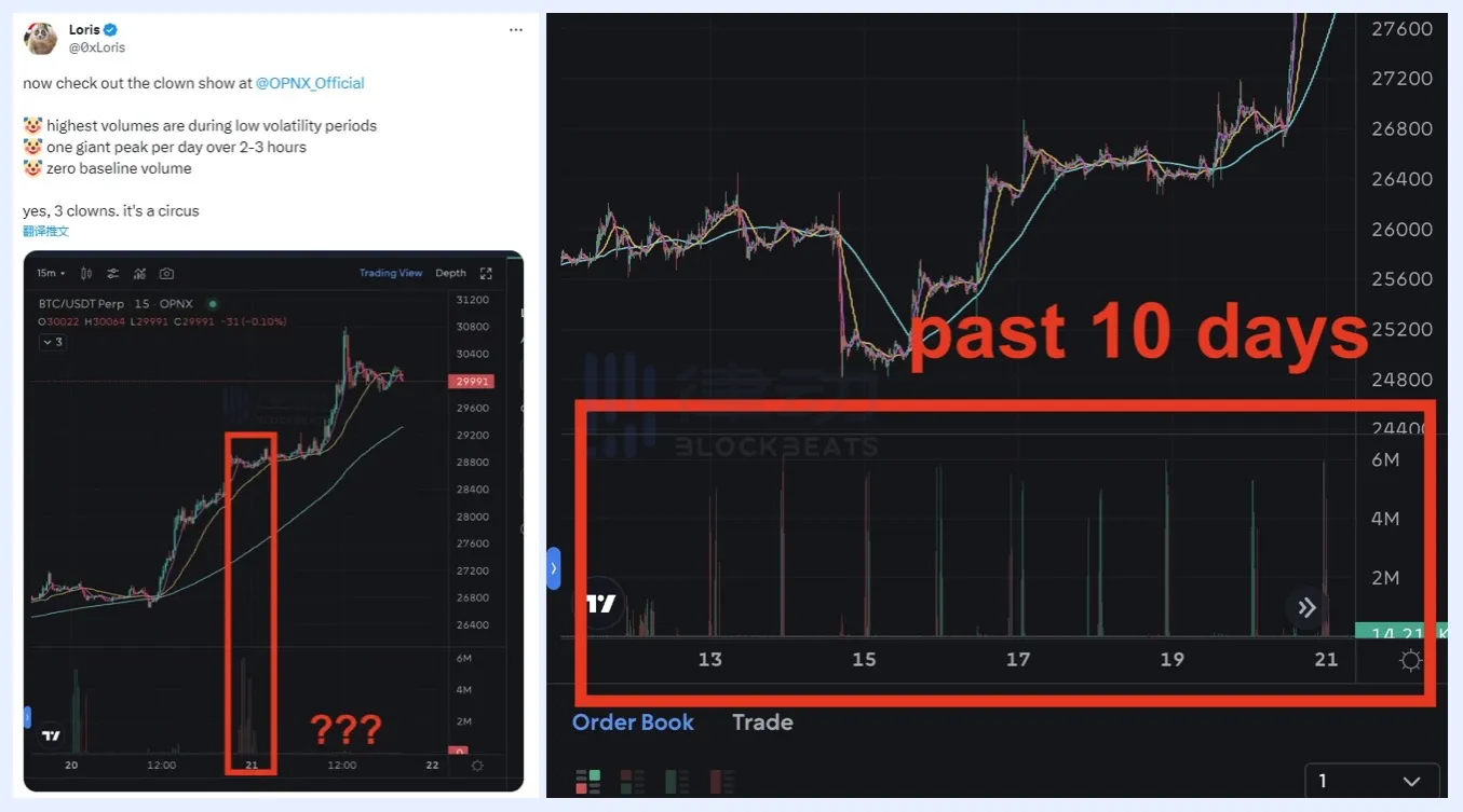 BlockBeats:前段时间,一位名为 @0xLoris 的市场研究员在推特上指出,OPNX 的 BTC 永续合约日成交量数据疑似存在虚假交易的问题。尽管该推文目前已被删除,但还是想听一听您的回复。@0xLoris 所说的这种情况是否属实呢?