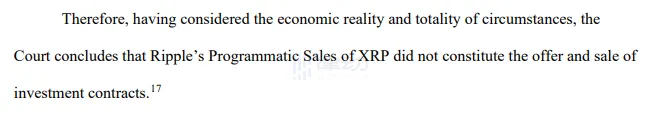 Coinbase 首席法律官paulgrewal认为,根据判决书第 15 页:「XRP 作为一种数字代币,其本身并不是体现投资合同 Howey 要求的「合同、交易 [、] 或计划」。」和第 25 页:「Ripple 在数字资产交易所上的 XRP 程序化销售并不构成投资合约的要约和销售。」XRP 已经符合上市条件。