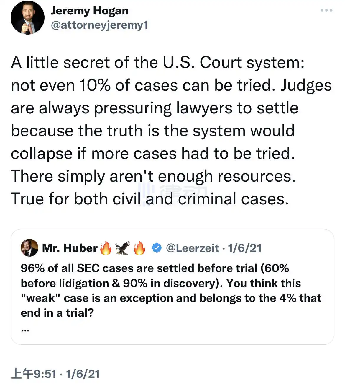 「这是美国法院系统的一个小秘密:甚至 10% 的案件都无法审理。法官总是向律师施压,要求他们和解,因为事实是,如果必须审理更多案件,系统就会崩溃。根本就没有足够的资源。对于民事和刑事案件都是如此。」著名律师 Jeremy Hogan 在推特上写道。